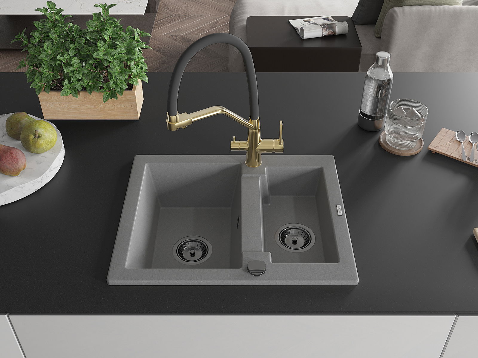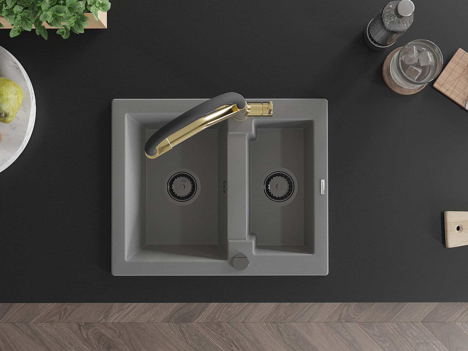 Mexen Carlos granitizlietne izlietne ar 1,5 nodalījumu un Duo virtuves jaucējkrānu, pelēka - 6518-71-671701-57-B