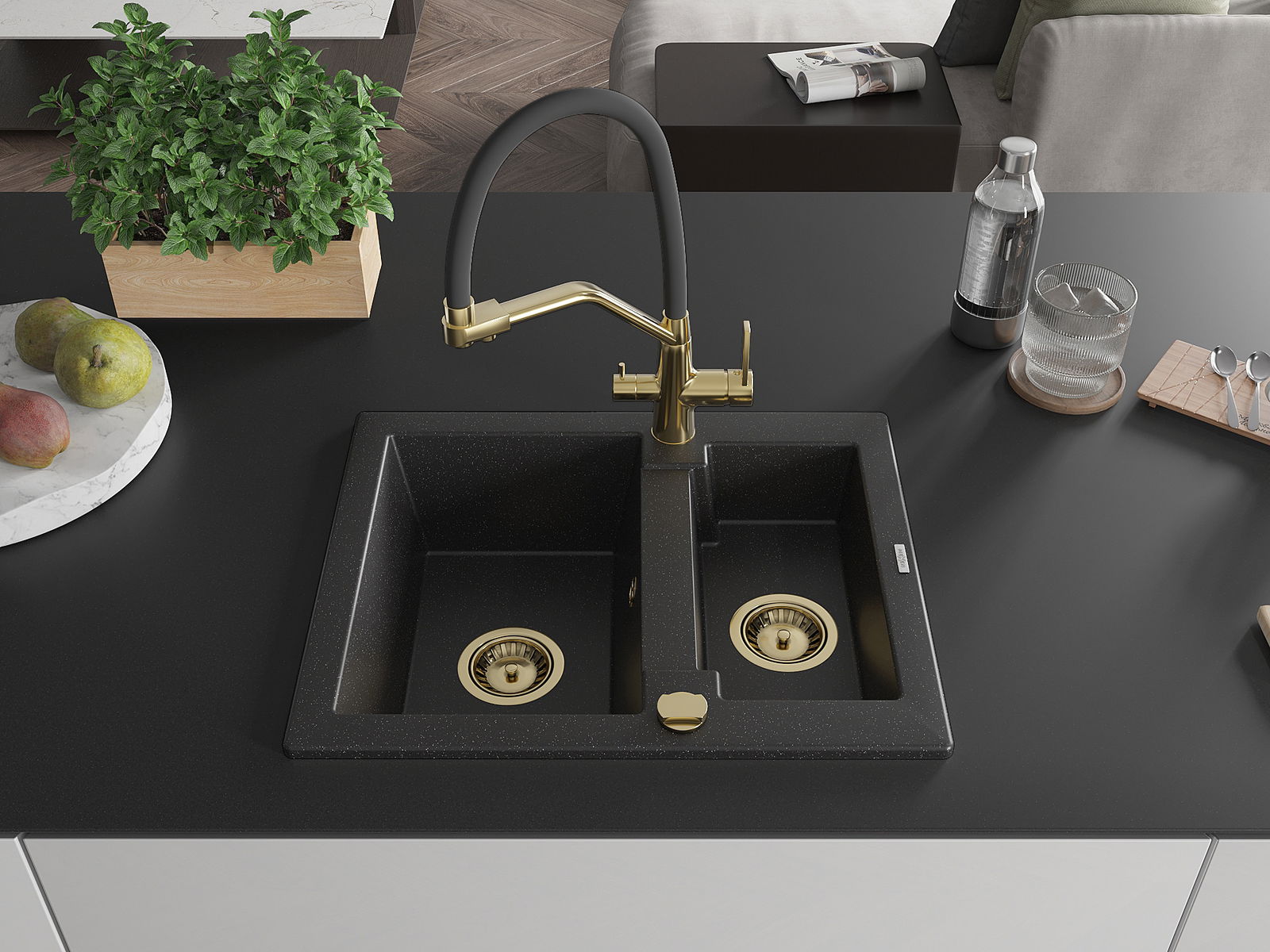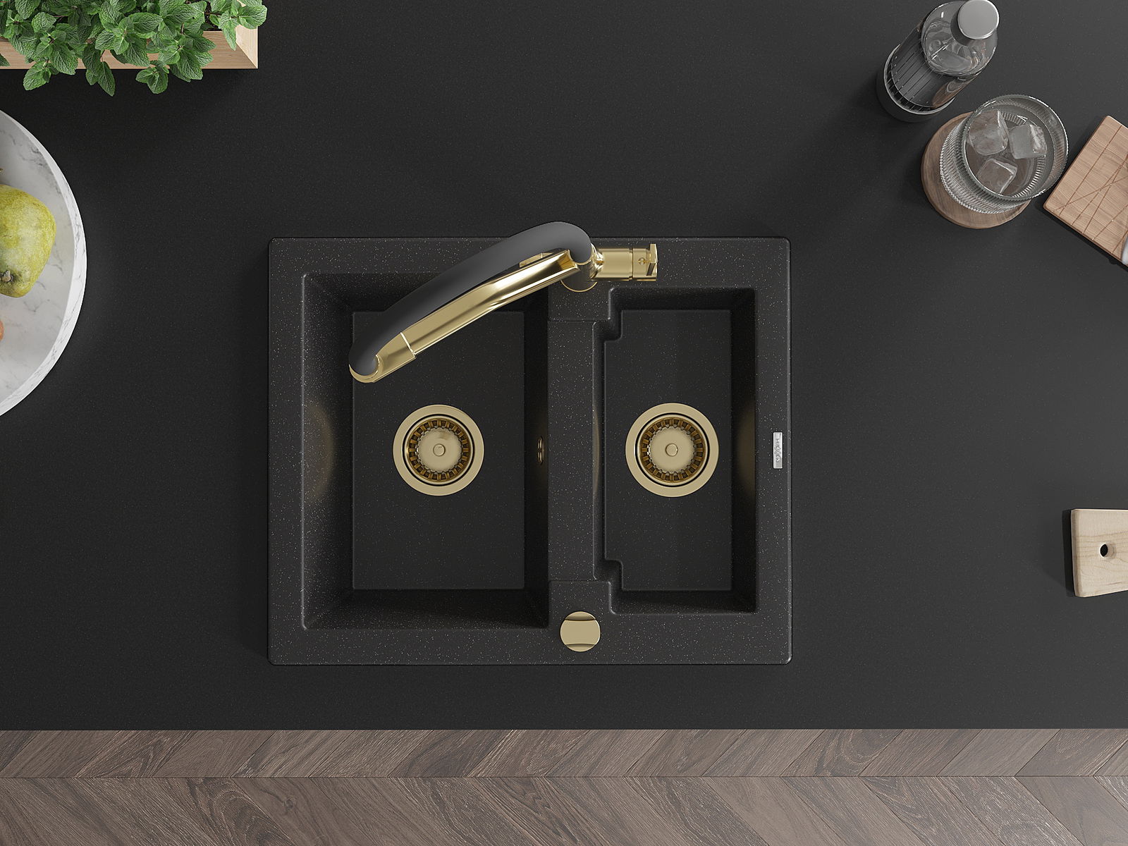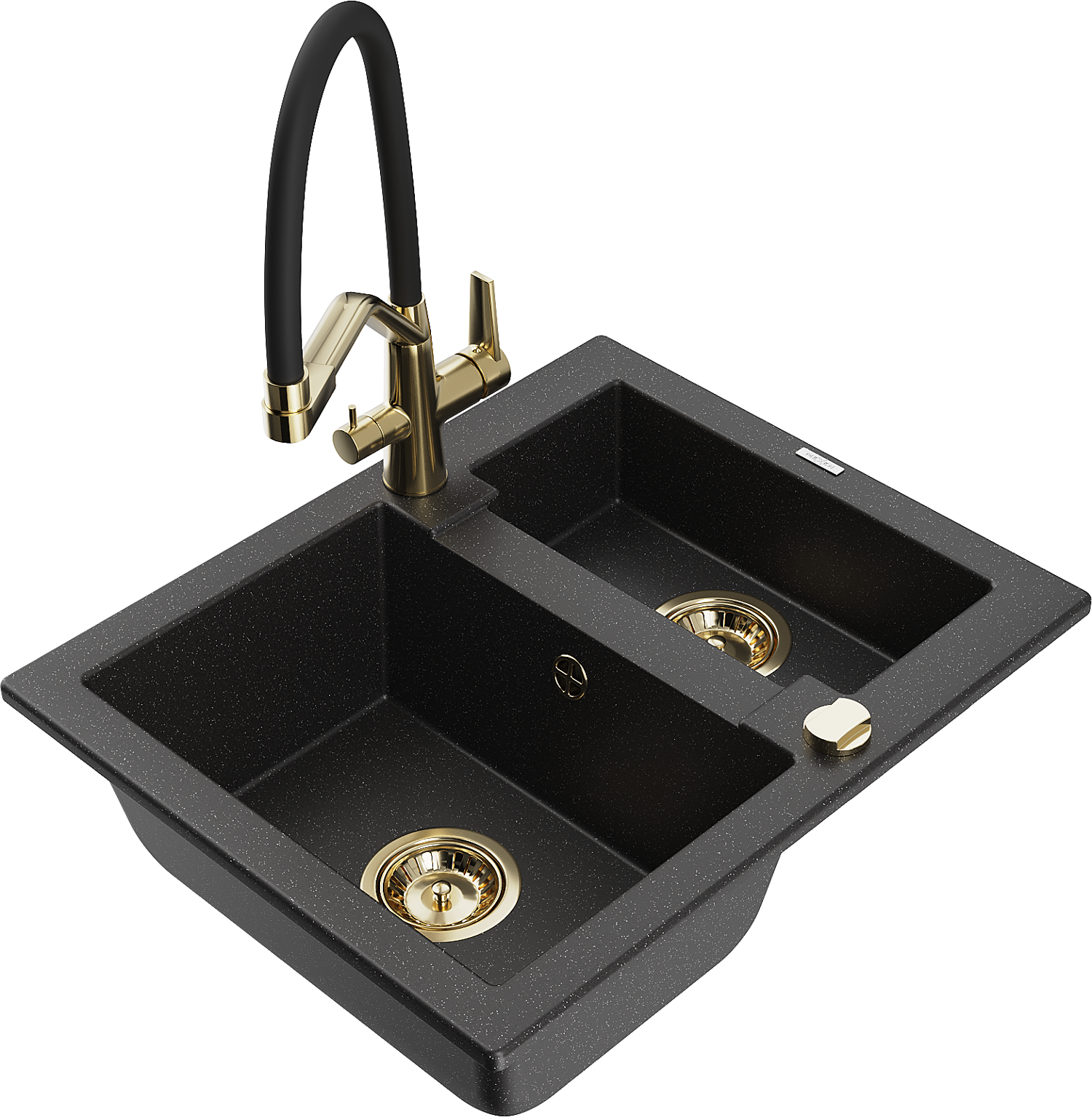 Mexen Carlos 1,5 nodalījuma granīta izlietne ar virtuves jaucējkrānu Duo, melns/sudraba metālika - 6518-73-671701-57-G