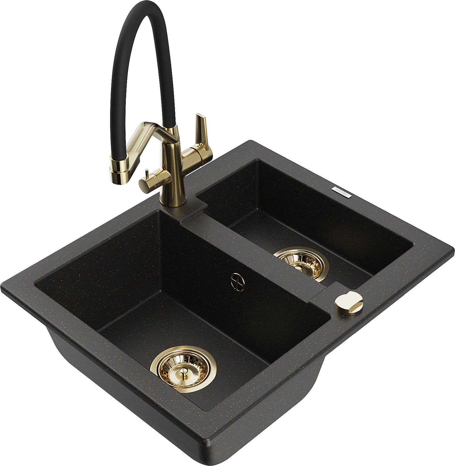Mexen Carlos granit izlietne ar 1,5 nodalījumu un virtuves jaucējkrānu Duo, melns/zeltains metālisks - 6518-75-671701-57-G