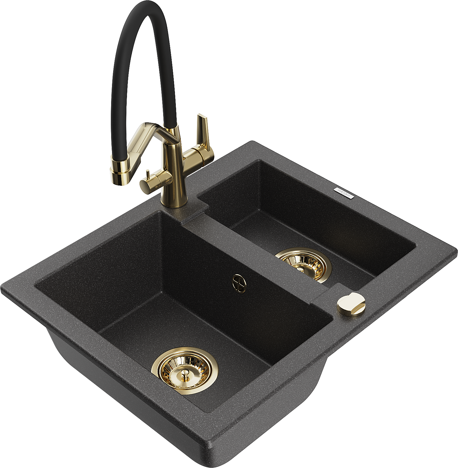 Mexen Carlos granitā izlietne 1,5 nodalījumu ar virtuves jaucējkrānu Duo, melns raibums - 6518-76-671701-57-G