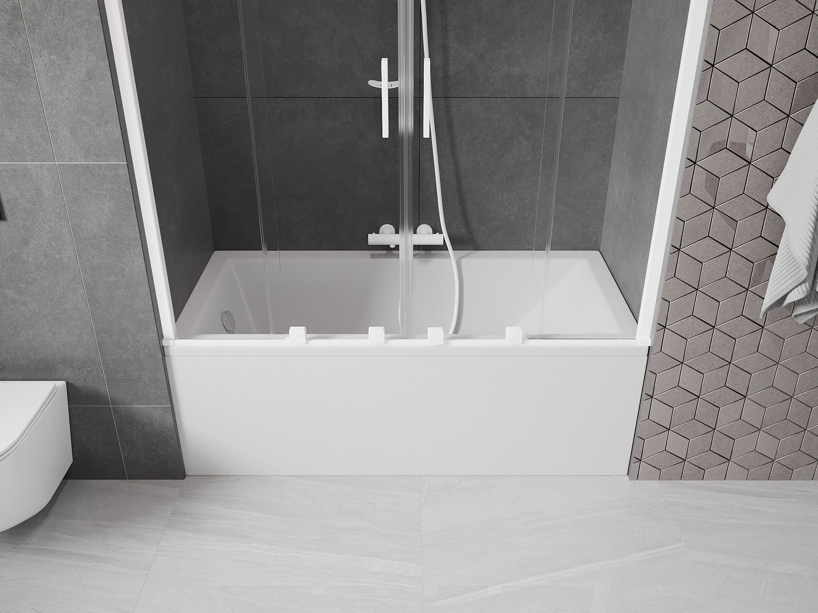 Efektīva aizsardzība pret ūdens izšļakstīšanos peldēšanās laikā. Ekrānam ir blīves, kas ideāli pielāgojas stikla virsmai un vannas malai. Funkcionāls risinājums, kas nodrošina drošību un vieglu tīrību.