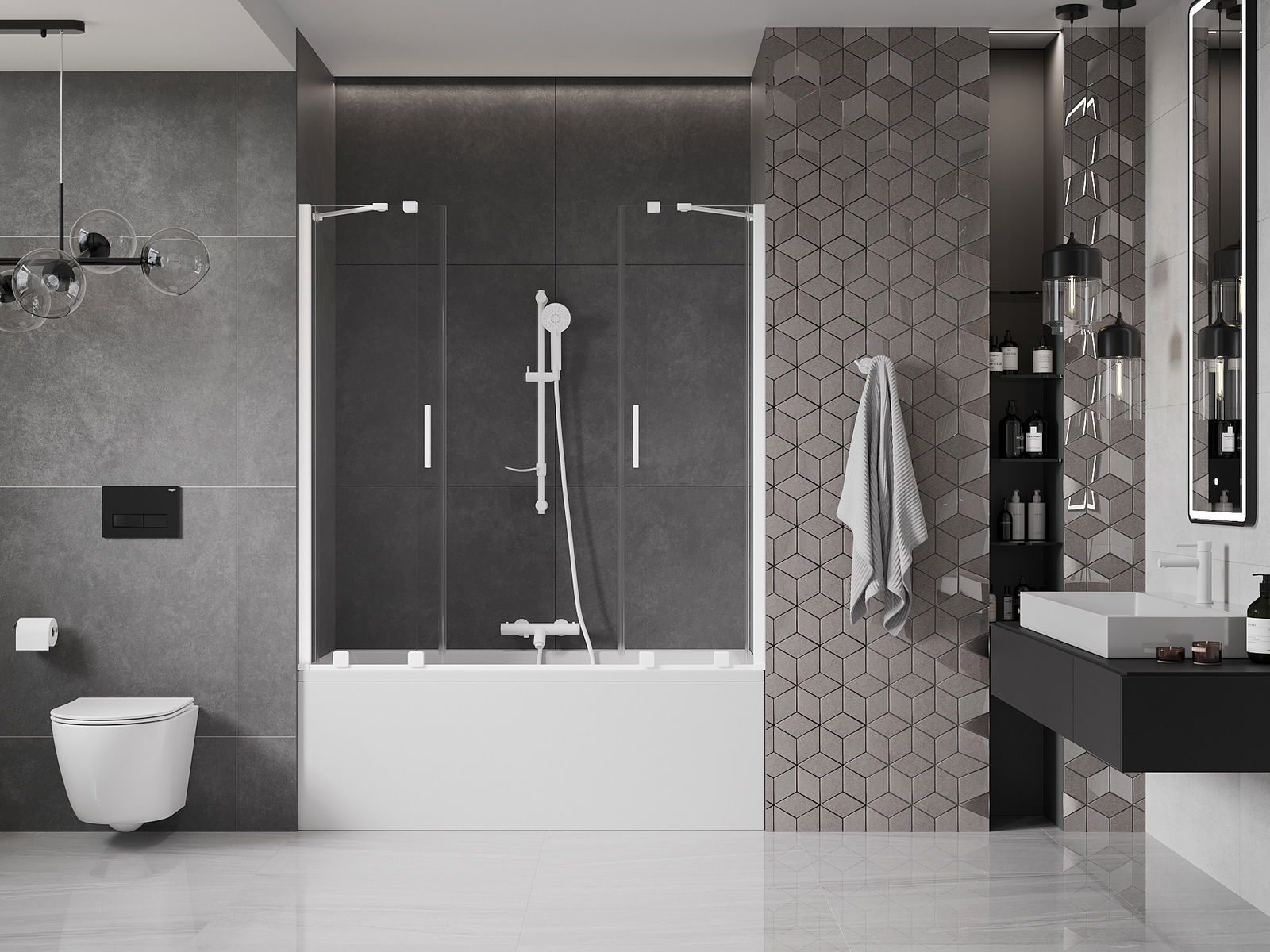 Pateicoties universālās montāžas sistēmas izmantošanai, ekrāns var tikt uzstādīts pa labi vai pa kreisi, atkarībā no vajadzībām. Tādā veidā jūs varat viegli izplānot dušu, kas ir pielāgota vannas istabas telpai.