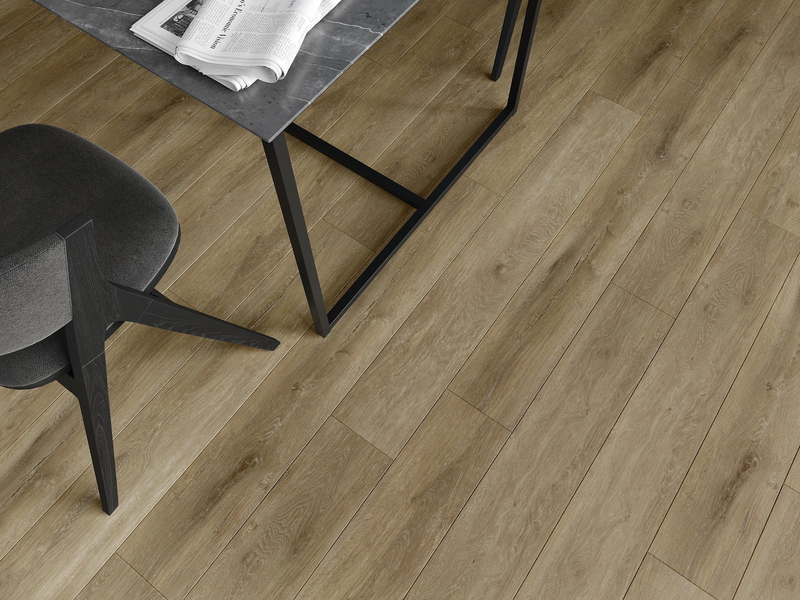 Paneļiem ir 4-pusējs fuga - katra mala ir frēzēta tā, lai pēc ieklāšanas izveidotos savienojums burta "V" formā. Šāds dizains padara grīdu izteiksmīgāku, piešķirot tai dziļumu un estētisku raksturu. Šis efekts ir īpaši novērtēts mūsdienu interjeros, kur detaļas izceļ telpas unikālo izskatu.