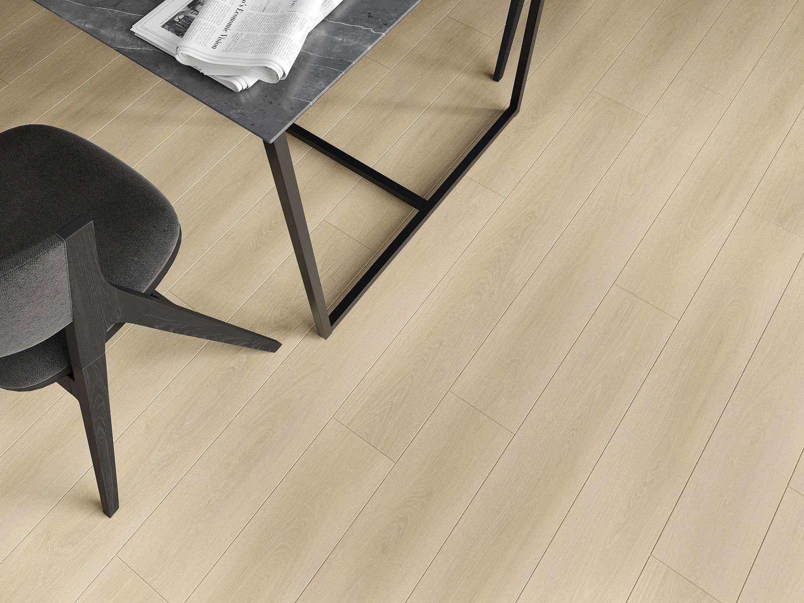 Paneļiem ir 4-pusējs fuga - katra mala ir frēzēta tā, lai pēc ieklāšanas izveidotos savienojums burta "V" formā. Šāds dizains padara grīdu izteiksmīgāku, piešķirot tai dziļumu un estētisku raksturu. Šis efekts ir īpaši novērtēts mūsdienu interjeros, kur detaļas izceļ telpas unikālo izskatu.