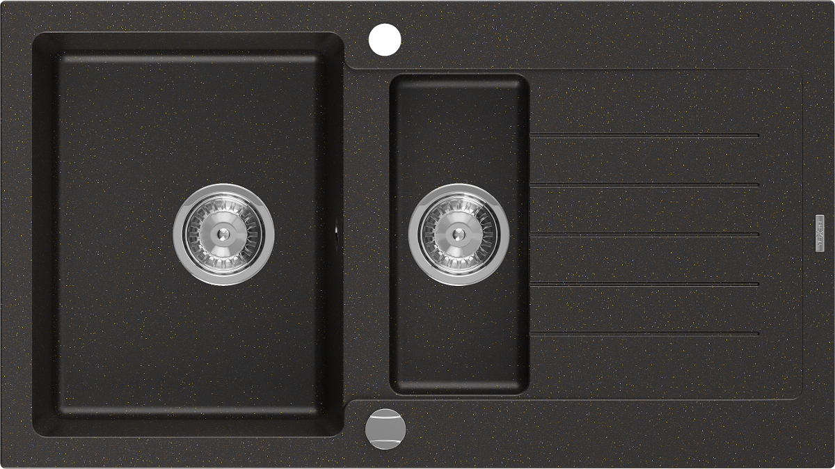 Mexen Matias granīta izlietne ar 1,5 nodalījumiem un noteces virsmu 900 x 505 mm, melns/zelta metāliks, hroma sifons