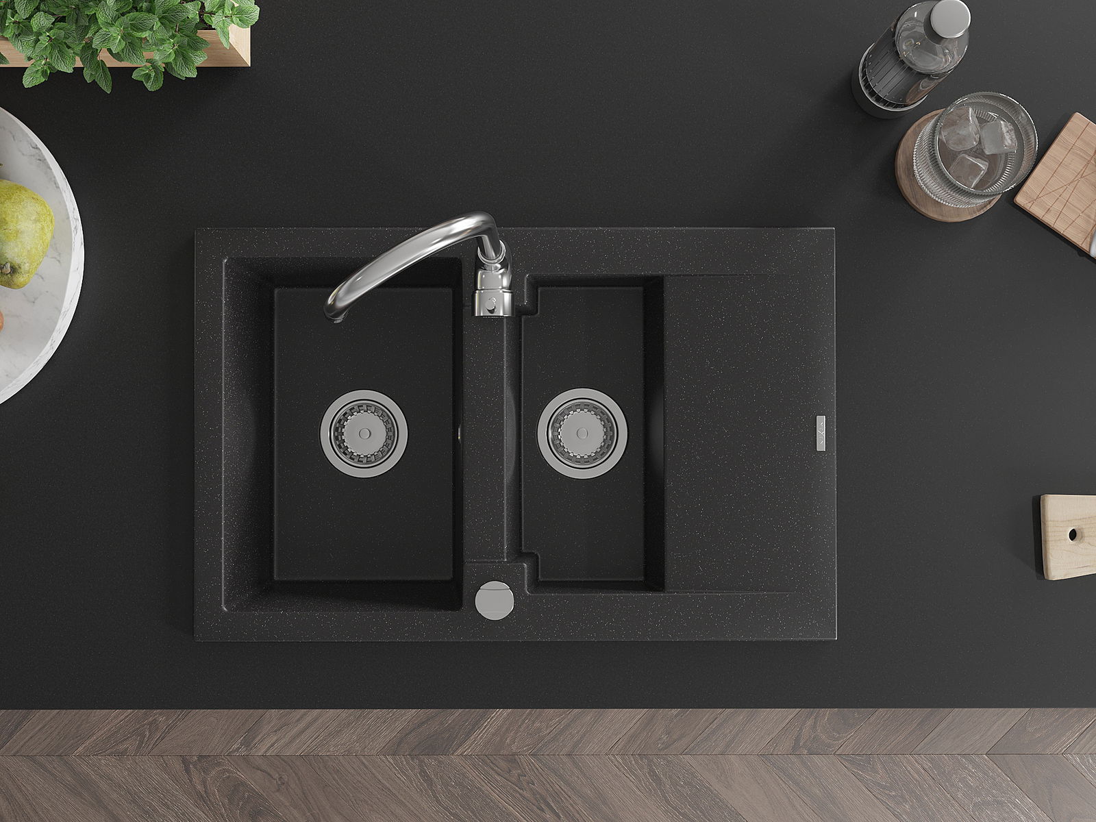 Mexen Gaspar Granit izlietne, 1,5 nodalījumu ar drenāžu 737 x 475 mm, melna/sudraba metālika, sifons - hroms - 6507731505-73