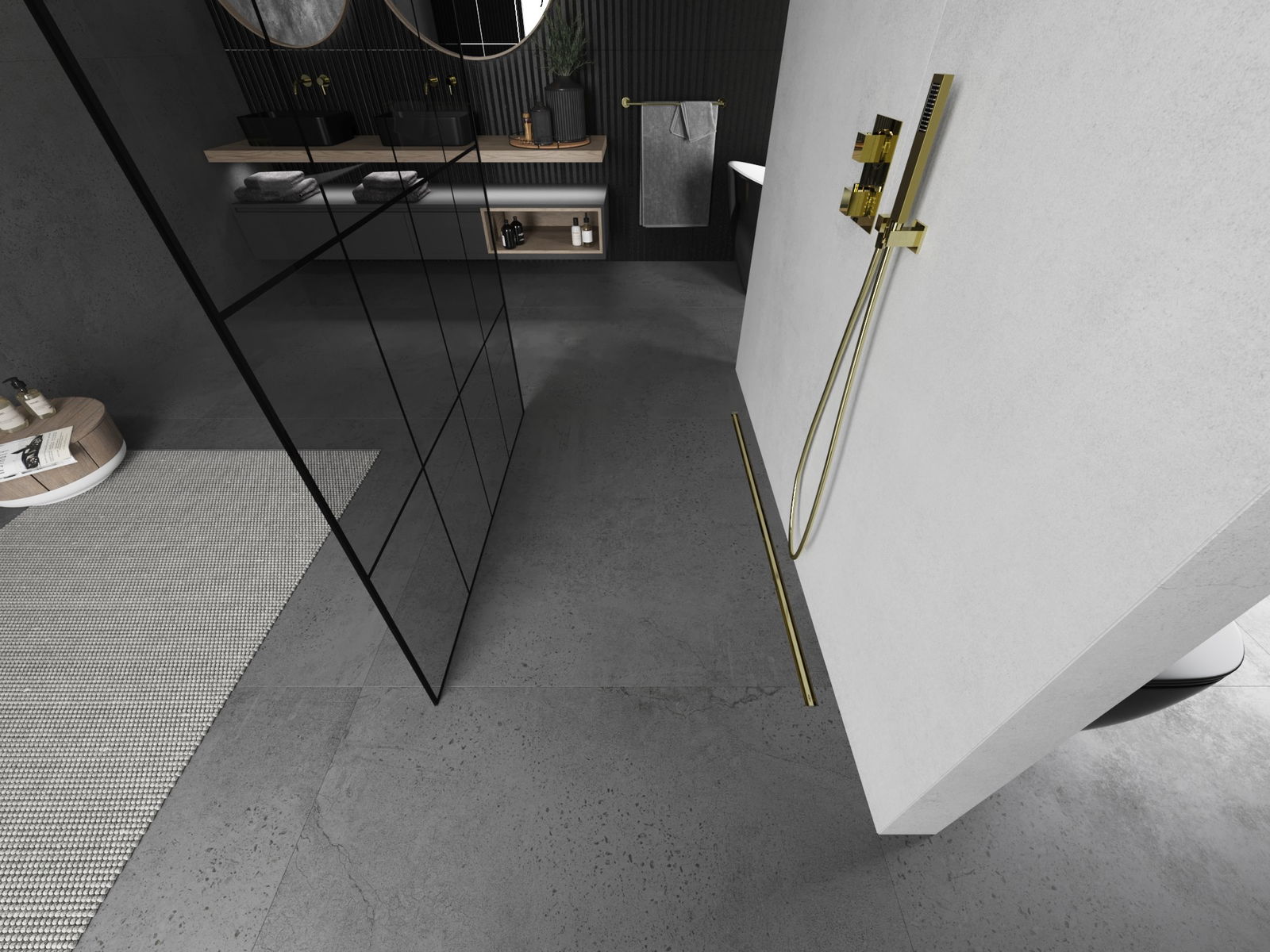 Mexen Kioto Brīvi stāvoša dušas siena 140 x 200 cm, melns režģis 8 mm, zelta matēta - 800-140-002-55-77
