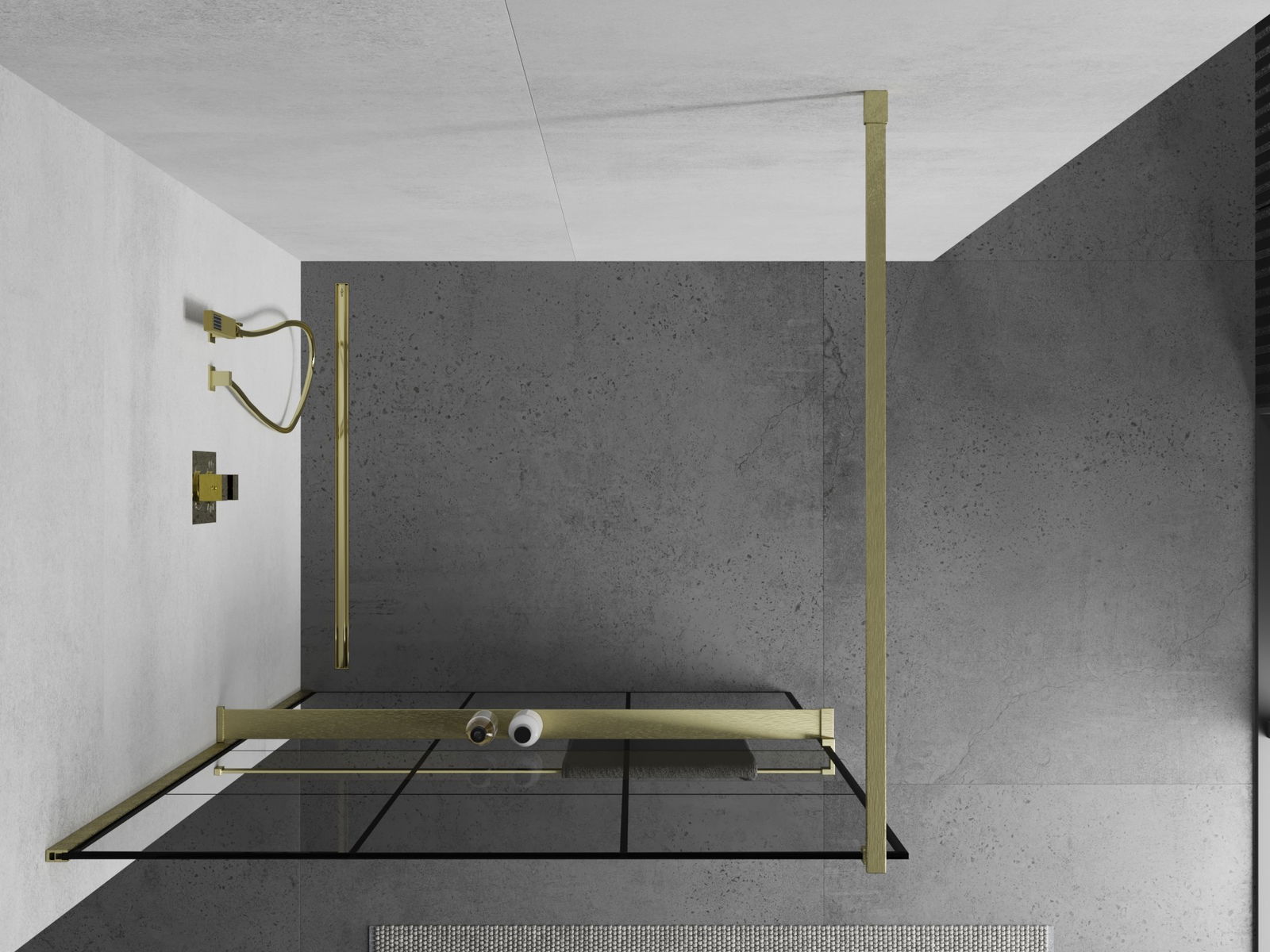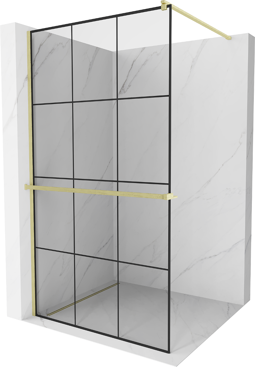 Mexen Kioto+ dušas siena ar plauktu Walk-in 110 x 200 cm, melns režģis, zelta birstes - 800-110-121-55-77