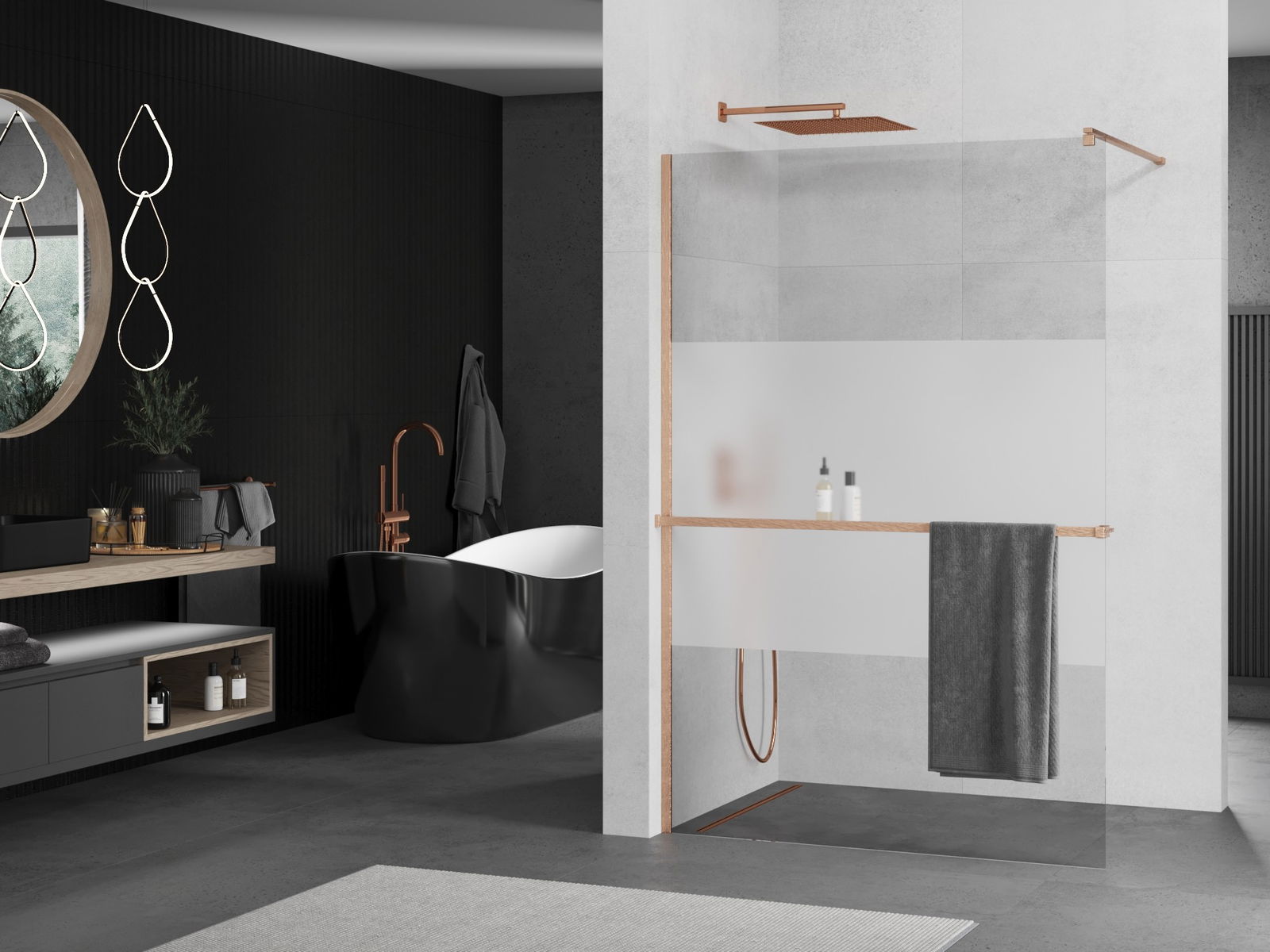 Mexen Kioto+ duša sienas ar plauktu Walk-in 90 x 200 cm, caurspīdīgs/matēts, matēts varš - 800-090-121-65-35