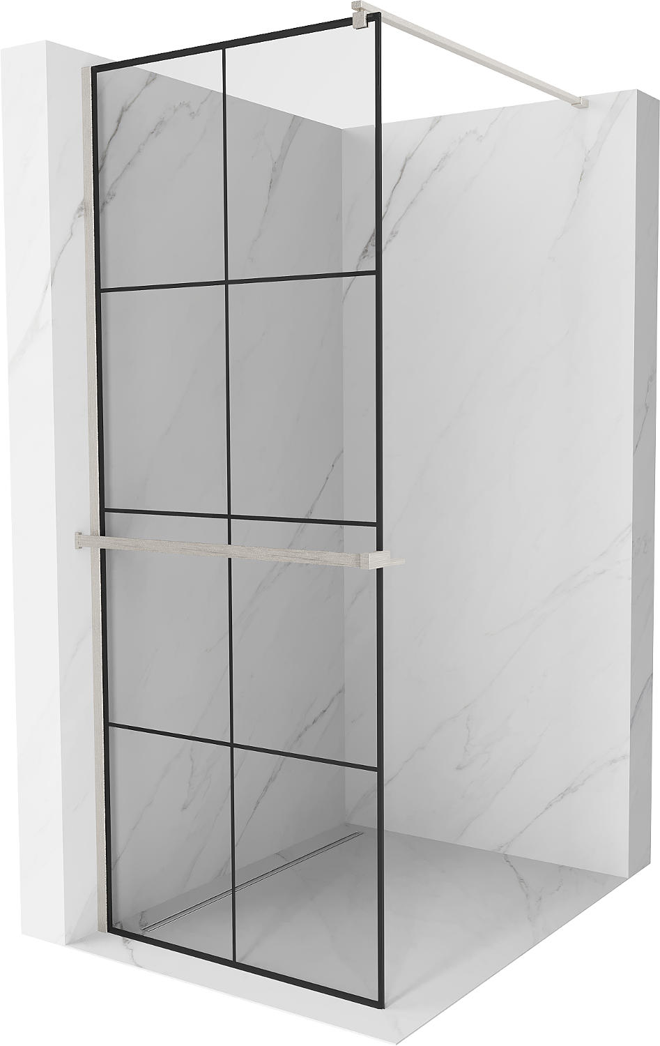 Mexen Kioto+ dušas siena ar plauktu Walk-in 90 x 200 cm, melns režģis, matēts niķelis - 800-090-121-97-77