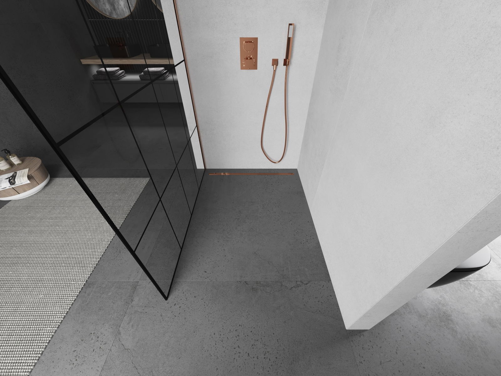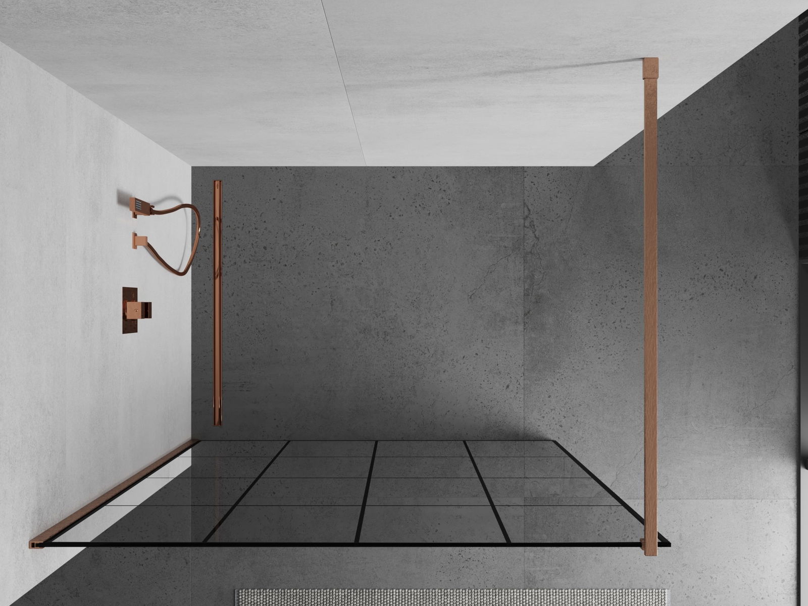 Mexen Kioto Dušas siena Walk-in 130 x 200 cm, melns režģis 8 mm, matēta vara - 800-130-101-65-77
