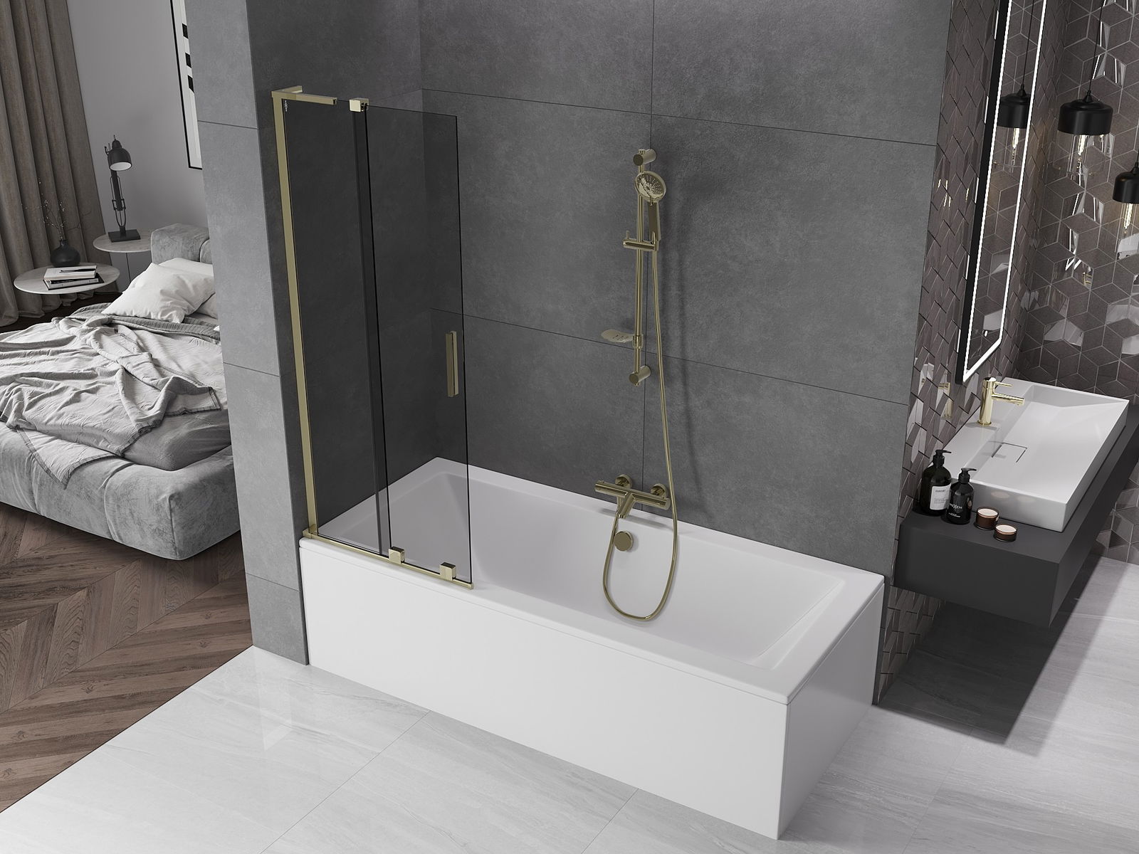 Mexen Velar L divviruļdurvju vannas ekrāns, 70 x 150 cm, grafīts, zelts - 896-070-003-41-50