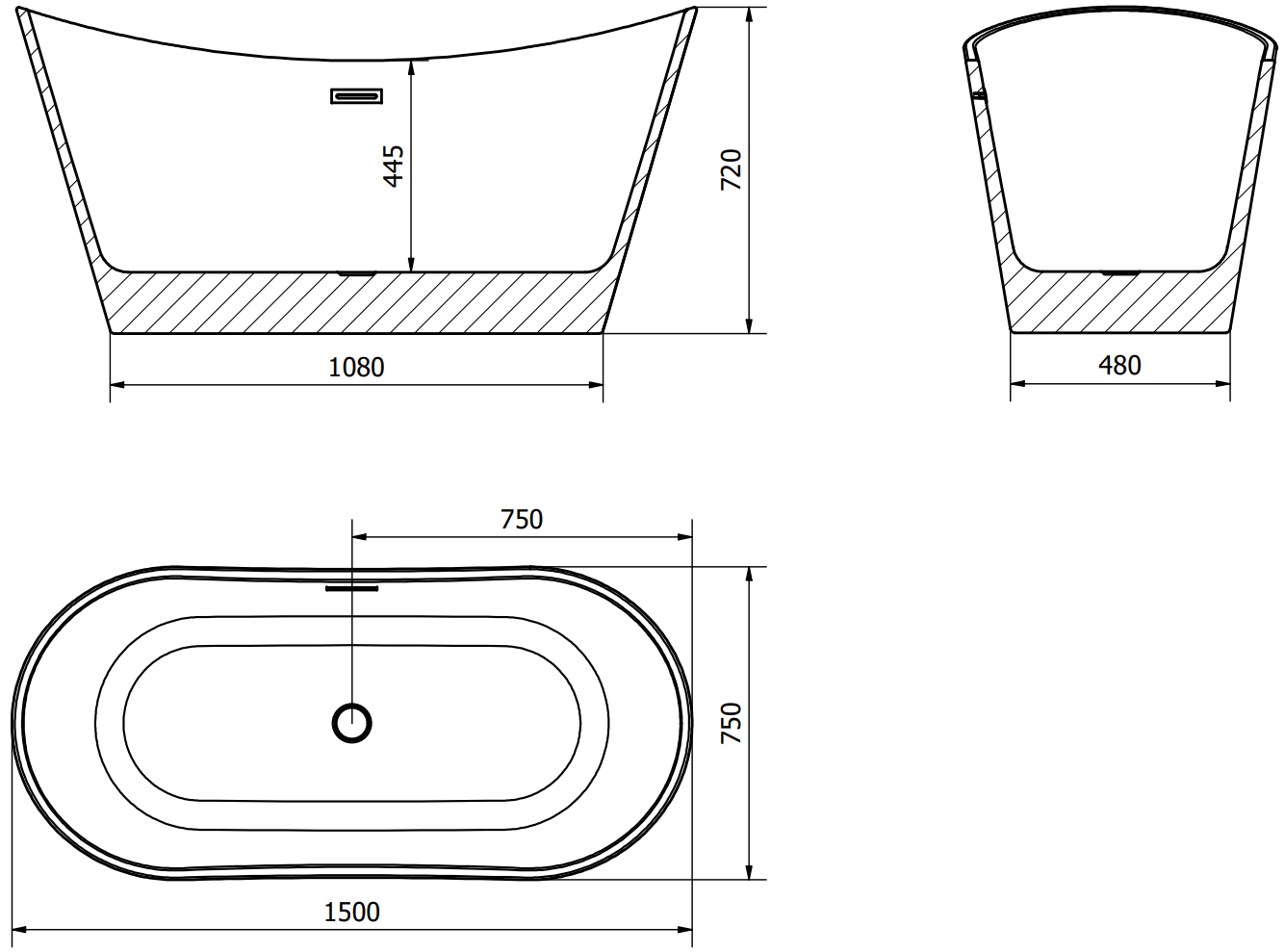 Mexen Montana brīvi stāvoša vanna 150 x 75 cm, balta/melna, hromēts pārplūdes - 52011507575-01