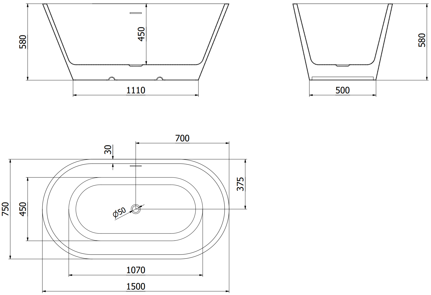 Mexen Luna brīvi stāvoša vanna 150 x 75 cm, balta, pārplūde gun metal - 52031507500-95