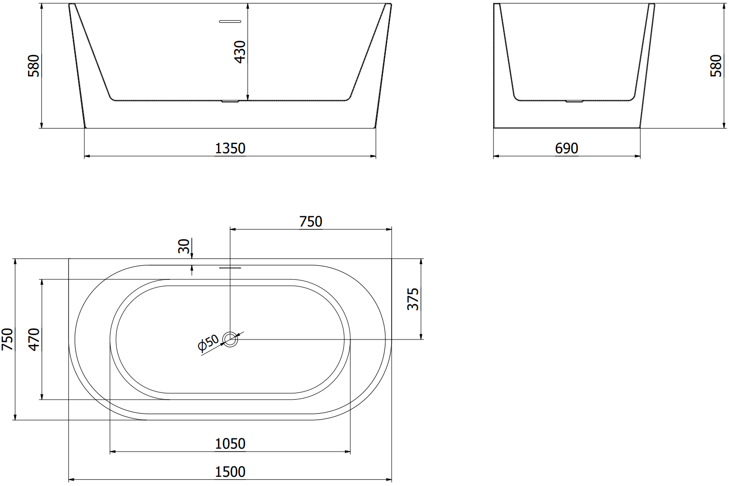 Mexen Oval brīvi stāvoša vanna pie sienas 150 x 75 cm, balta/melna, hromēta pārplūde - 52671507575-01