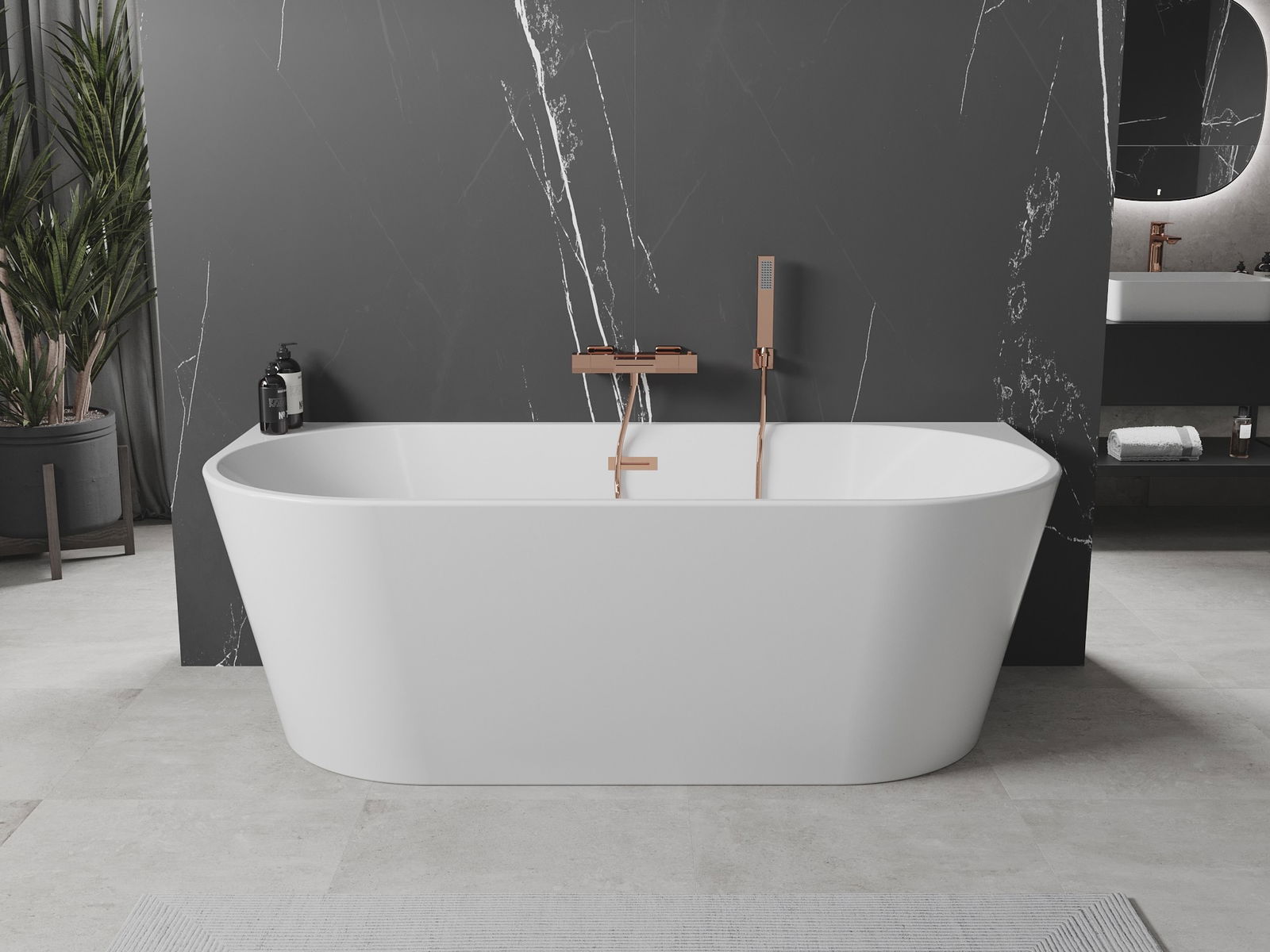Mexen Oval ir stilīga brīvi stāvoša vanna ar izmēriem 180 x 80 cm, kas izgatavota no augstas kvalitātes sanitārā akrila. Tās elegantā baltā krāsa un apdare rozā zelta krāsā piešķir vannas istabai mūsdienīgu izskatu. Vanna ir izturīga pret matēšanu un UV starojumu, nodrošinot ilgstošu estētiku. Tai ir pārplūdes atvere, kas palielina lietošanas komfortu. Pateicoties montāžai pie sienas, tā lieliski iekļaujas dažādās interjera kompozīcijās, kļūstot par jebkuras vannas istabas centrālo punktu.
