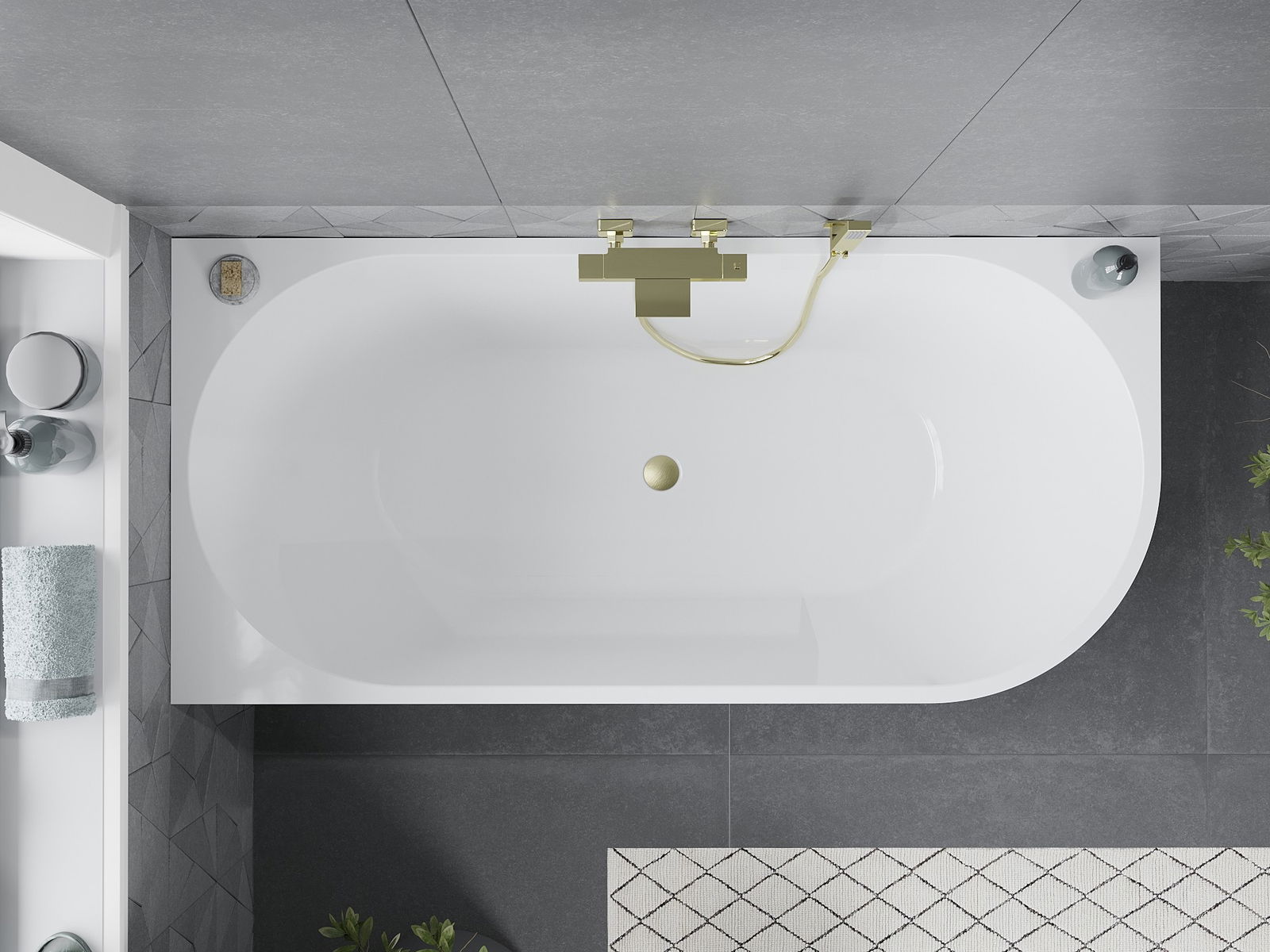 Mexen Mia brīvi stāvoša stūra vanna kreisā 150 x 75 cm, balta, ar zelta matētu pārplūdi - 52691507500L-55