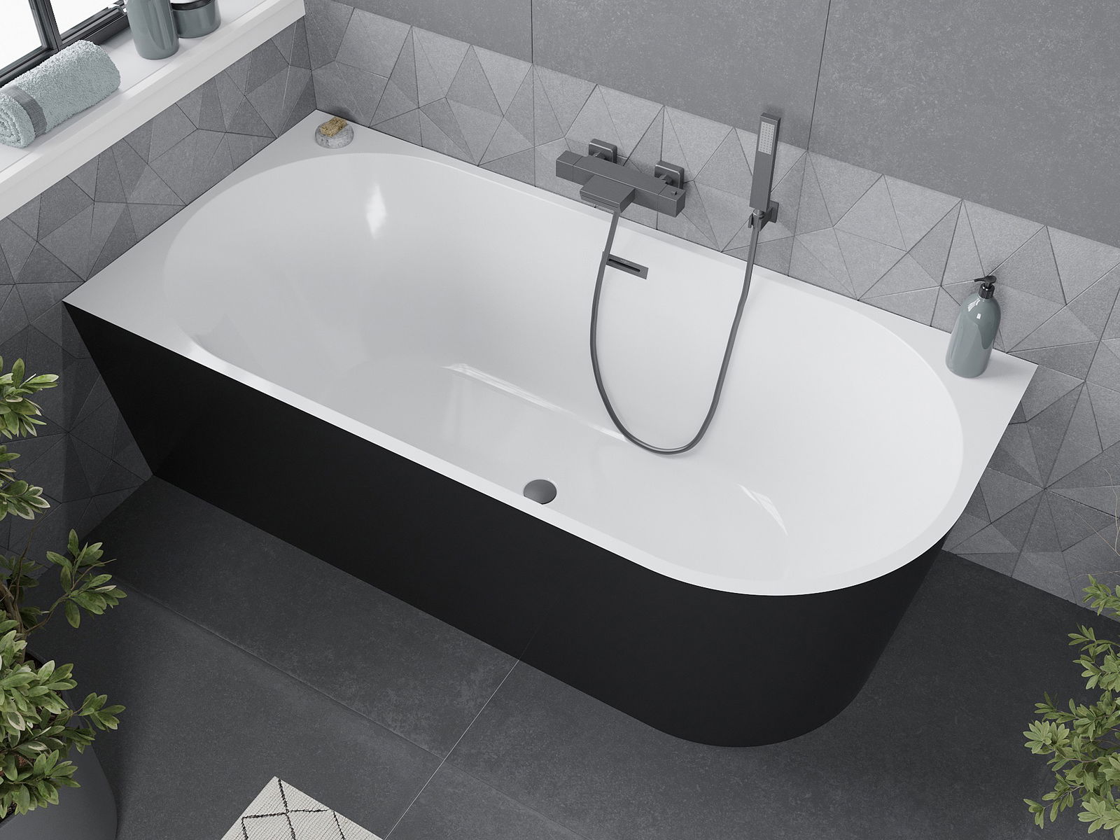 Mexen Mia brīvi stāvoša stūra vanna kreisā 160 x 75 cm, balta/melna, pārplūdes gunmetal - 52691607575L-95