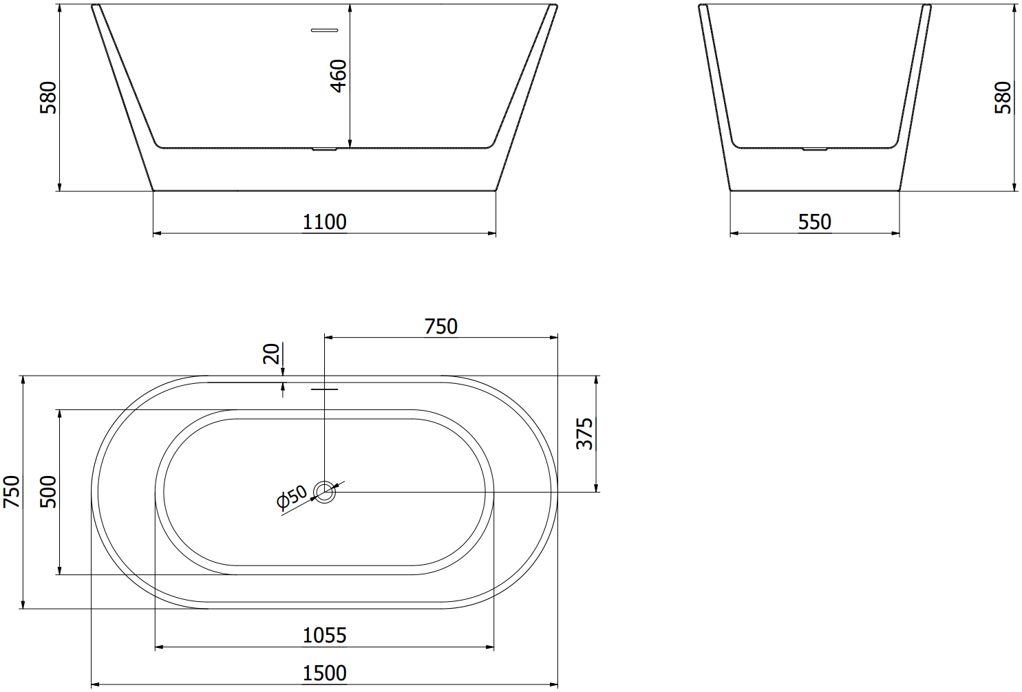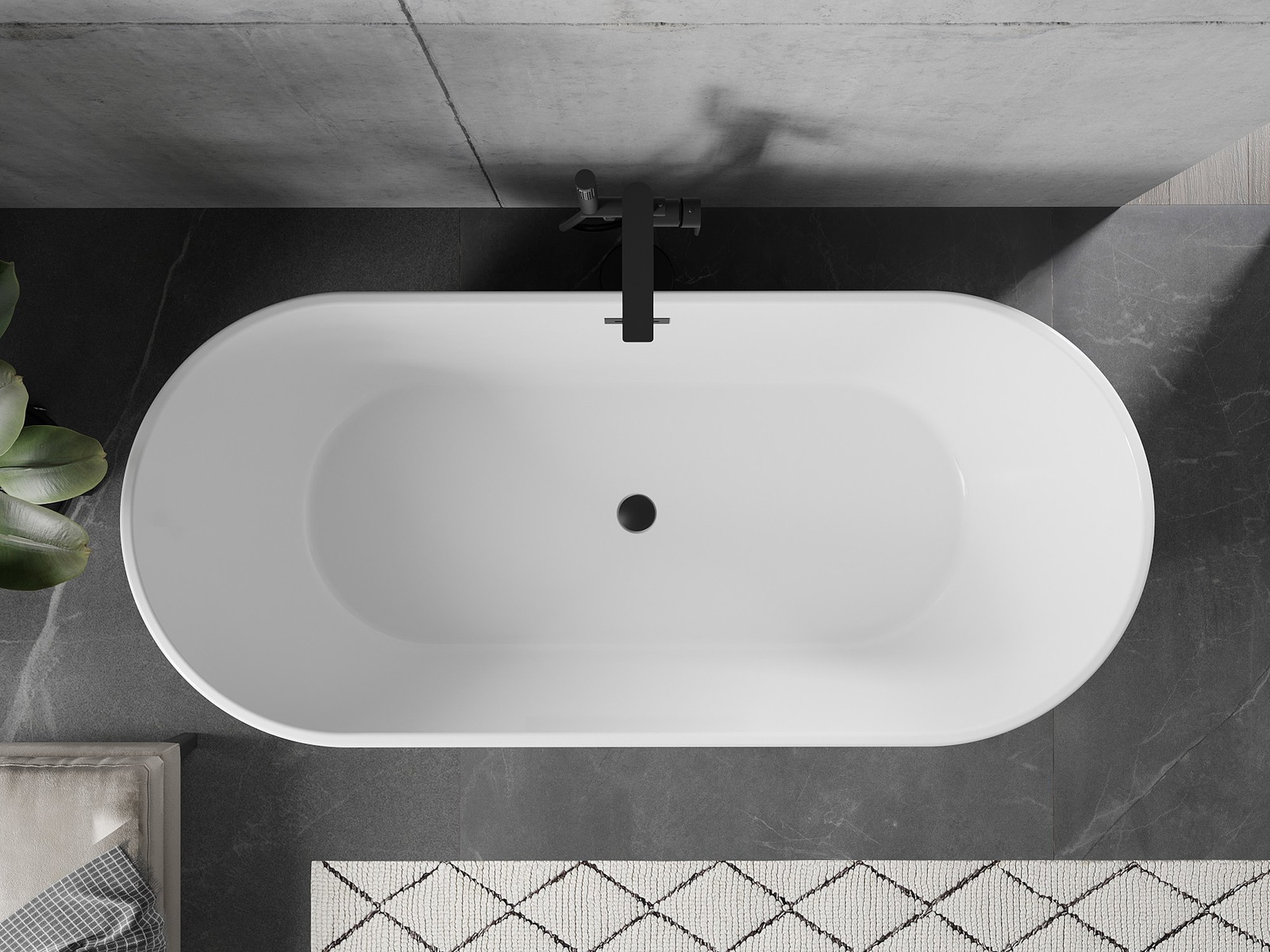 Mexen Flavia brīvi stāvoša vanna 150 x 75 cm, balta, pārliešanas atvere melna - 54031507500-B