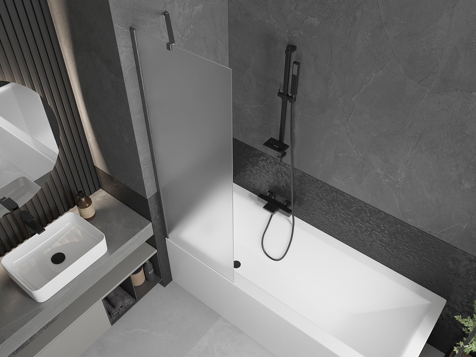 Efektīva aizsardzība pret ūdens izšļakstīšanos peldēšanās laikā. Ekrānam ir blīves, kas ideāli pielāgojas stikla virsmai un vannas malai. Funkcionāls risinājums, kas nodrošina drošību un vieglu tīrību.