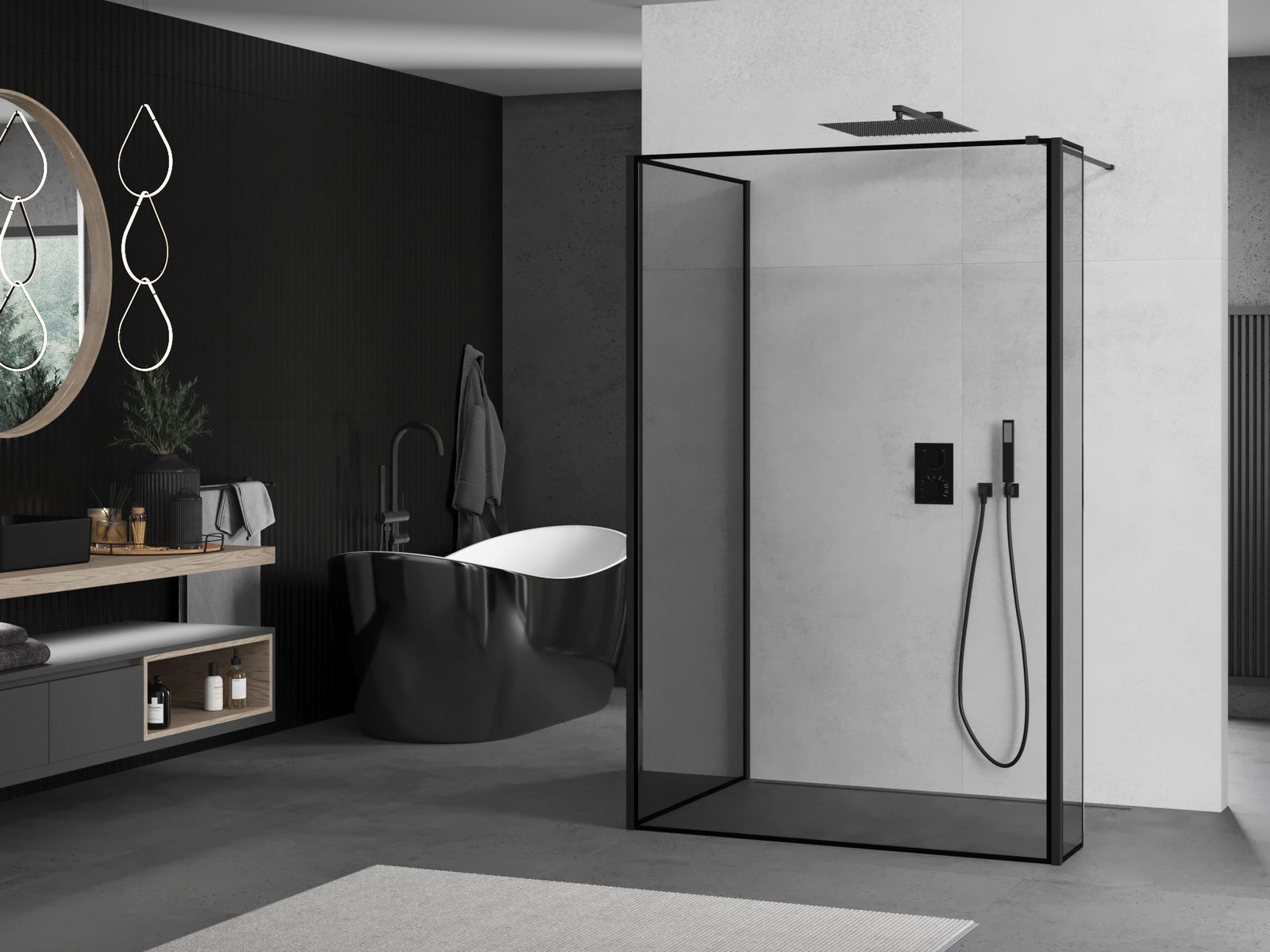 Mexen Kioto duša sienas Walk-in 140 x 80 x 30 cm, melns rāmis, melns - 800-140-080-221-70-70-030