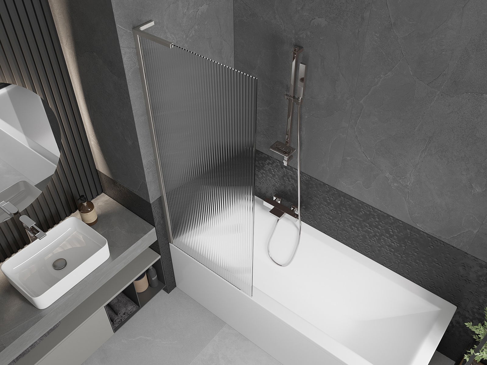Efektīva aizsardzība pret ūdens izšļakstīšanos peldēšanās laikā. Ekrānam ir blīves, kas ideāli pielāgojas stikla virsmai un vannas malai. Funkcionāls risinājums, kas nodrošina drošību un vieglu tīrību.