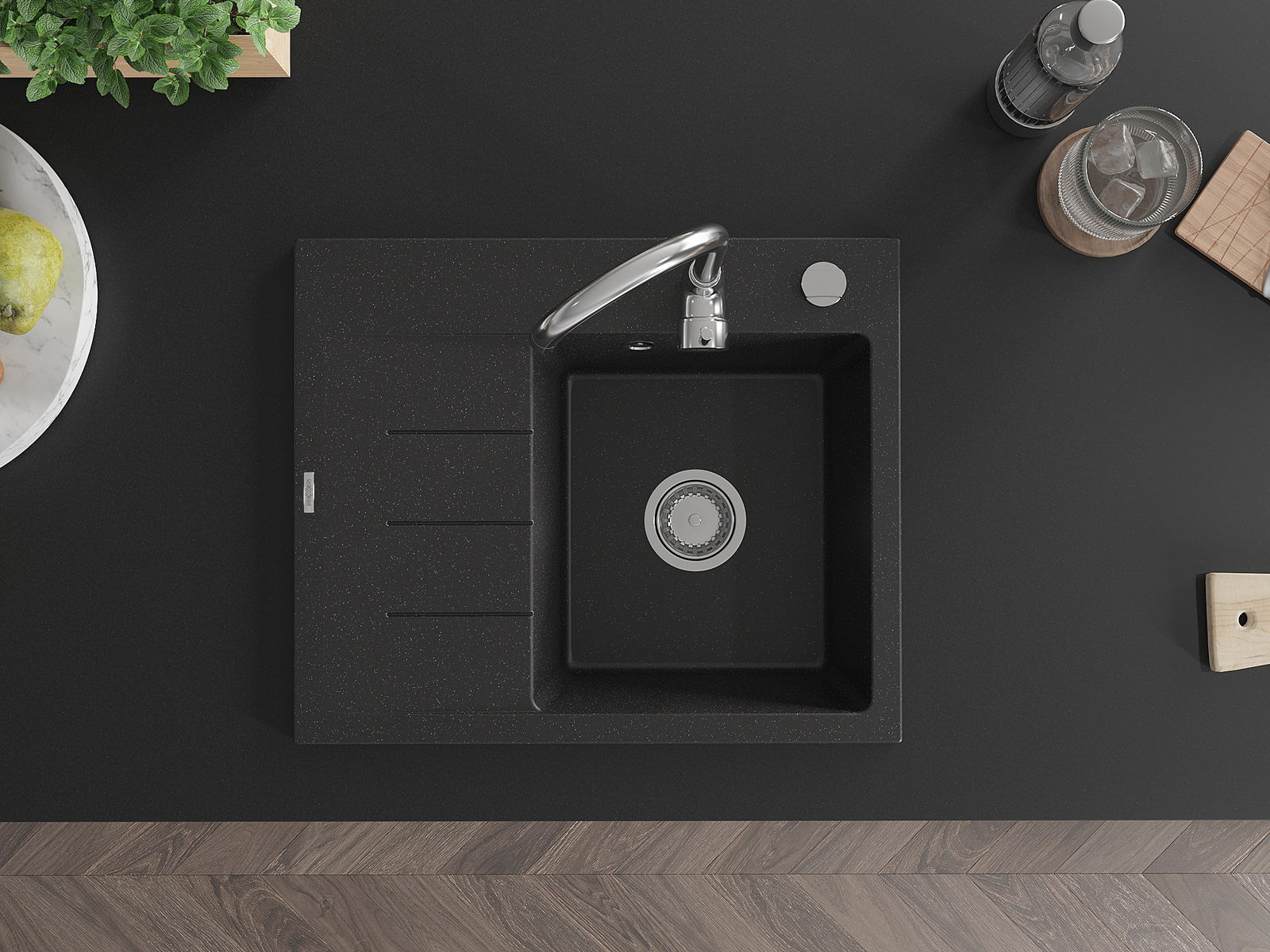 Mexen Ben granit mazgātava ar vienu nodalījumu un noteces vietu, labā puse 600 x 500 mm, melna/sudraba metālika, hromēts