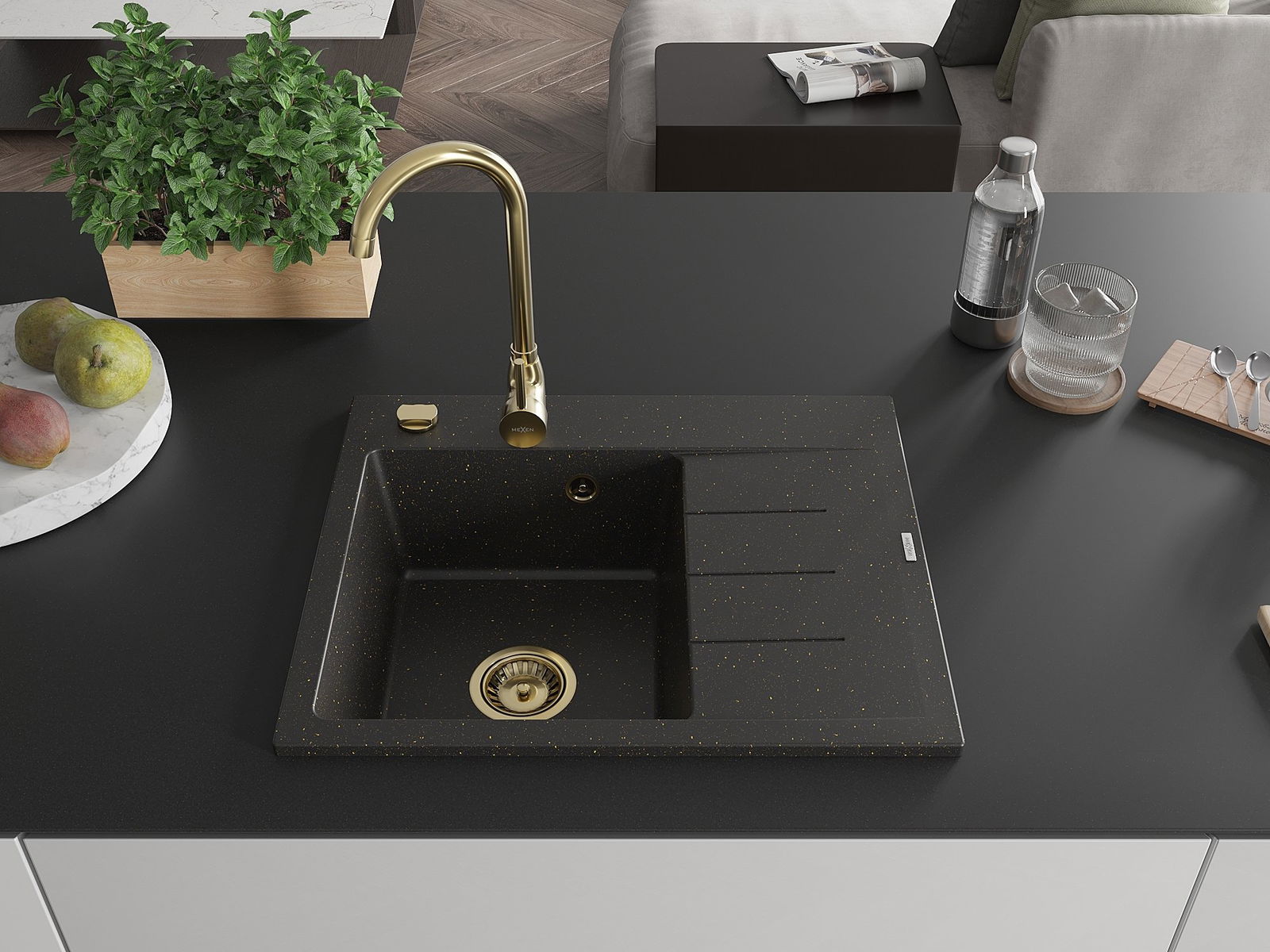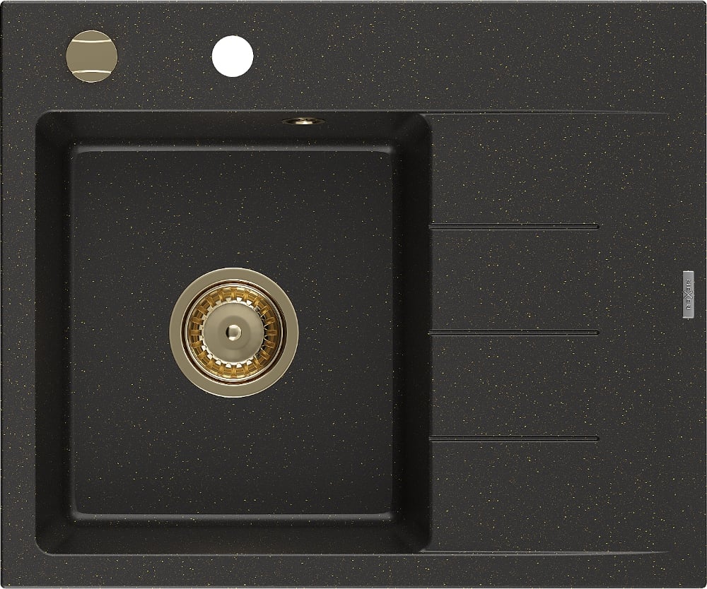 Mexen Ben granīta izlietne ar vienu nodalījumu un noteces paneli, kreisā 600 x 500 mm, melna/zelta metāliks, zelta sifons