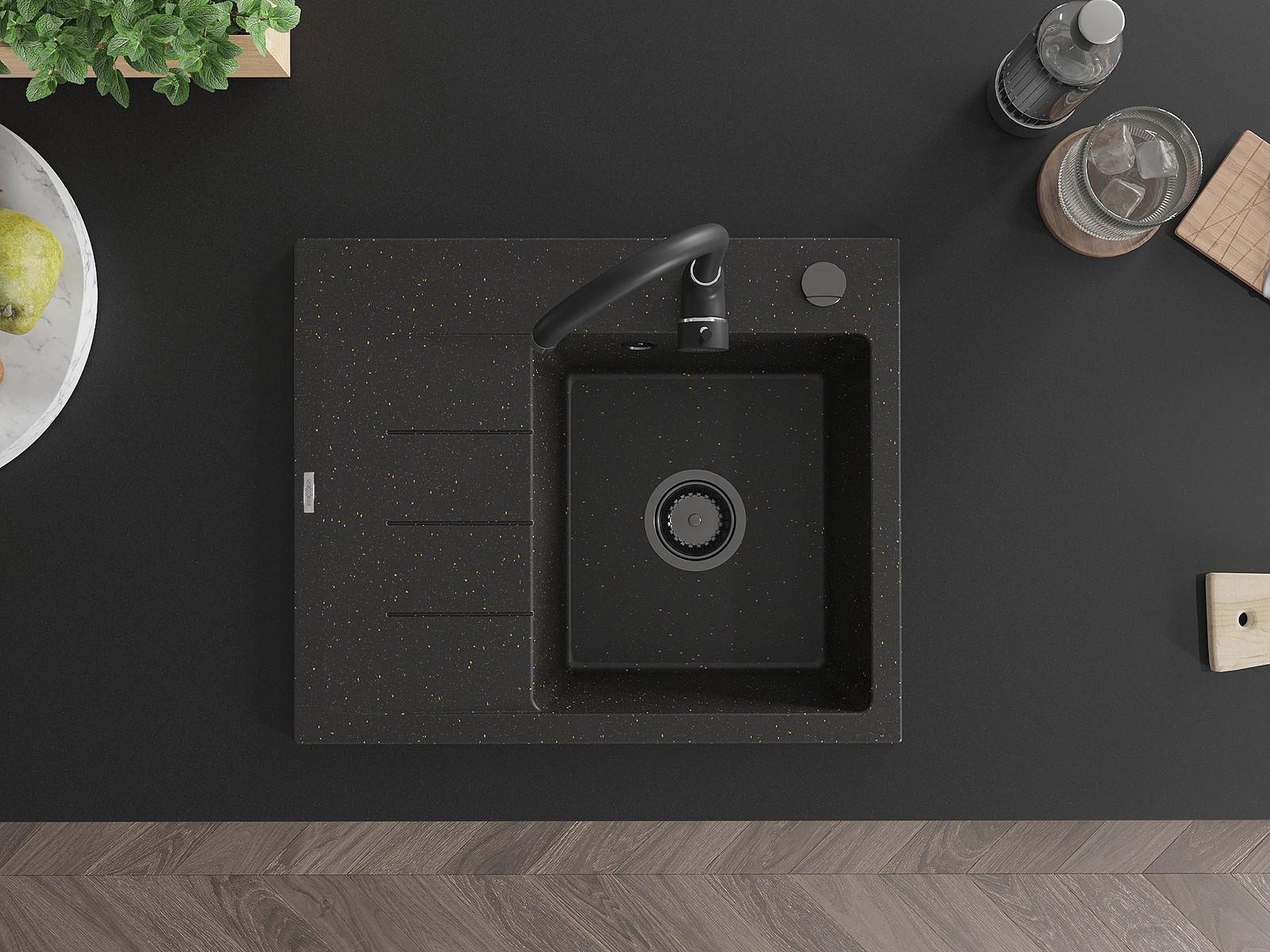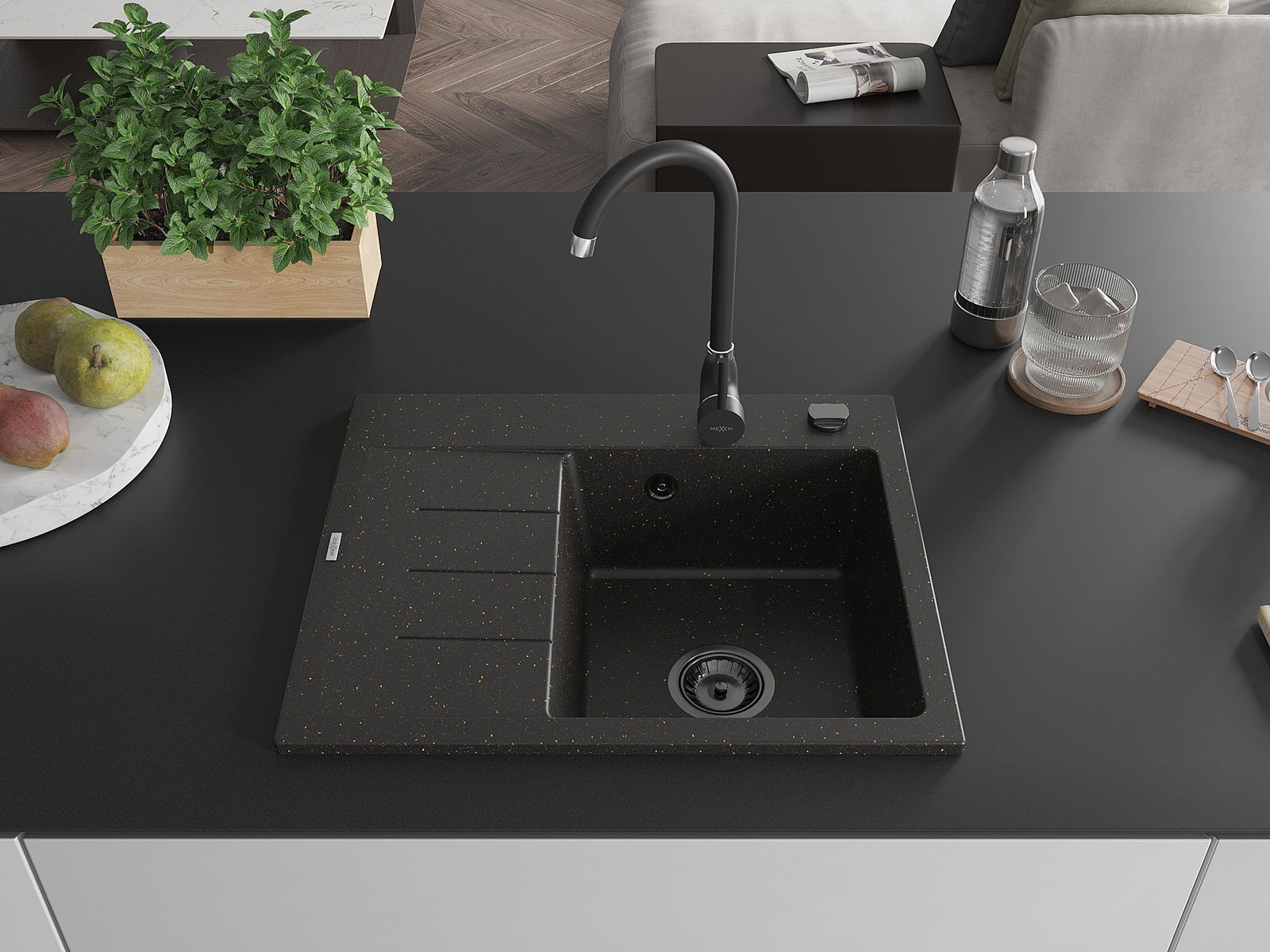 Mexen Ben granit izlietne ar vienu nodalījumu un noteces vietu, labā puse 600 x 500 mm, melns/zelta metālika sifons melns