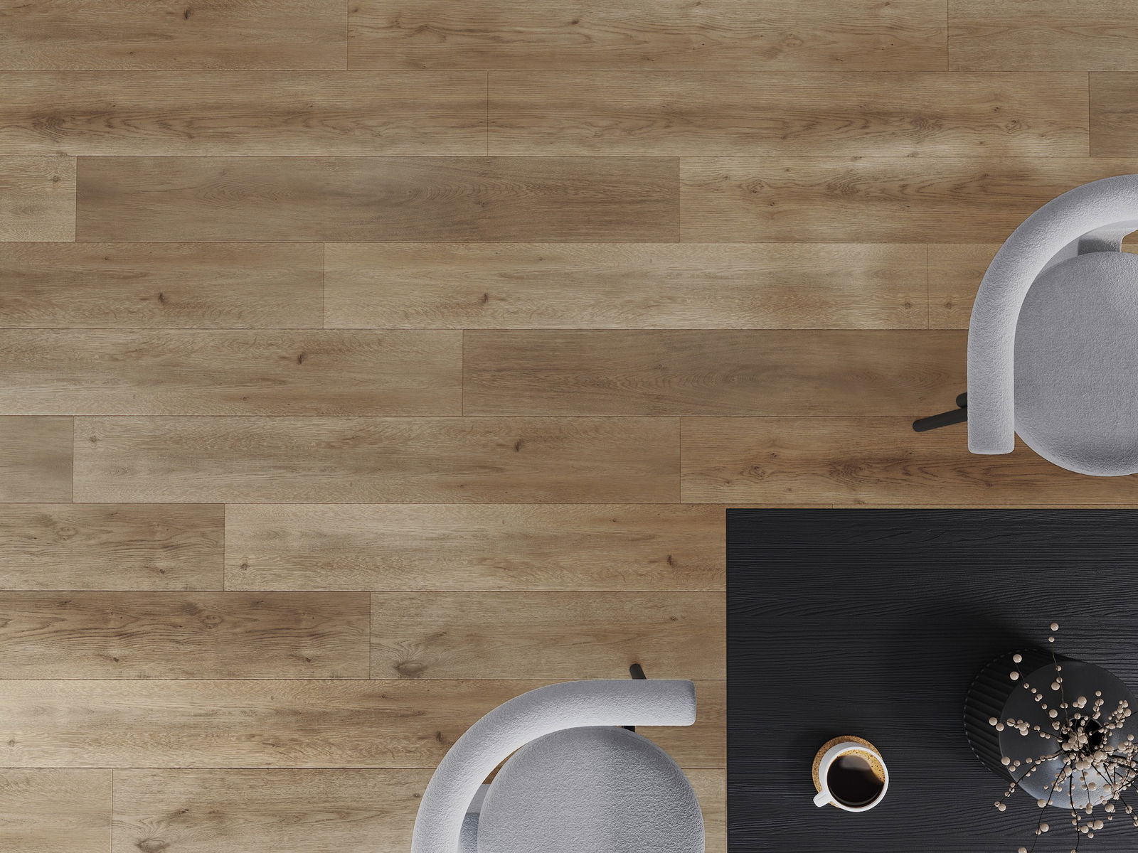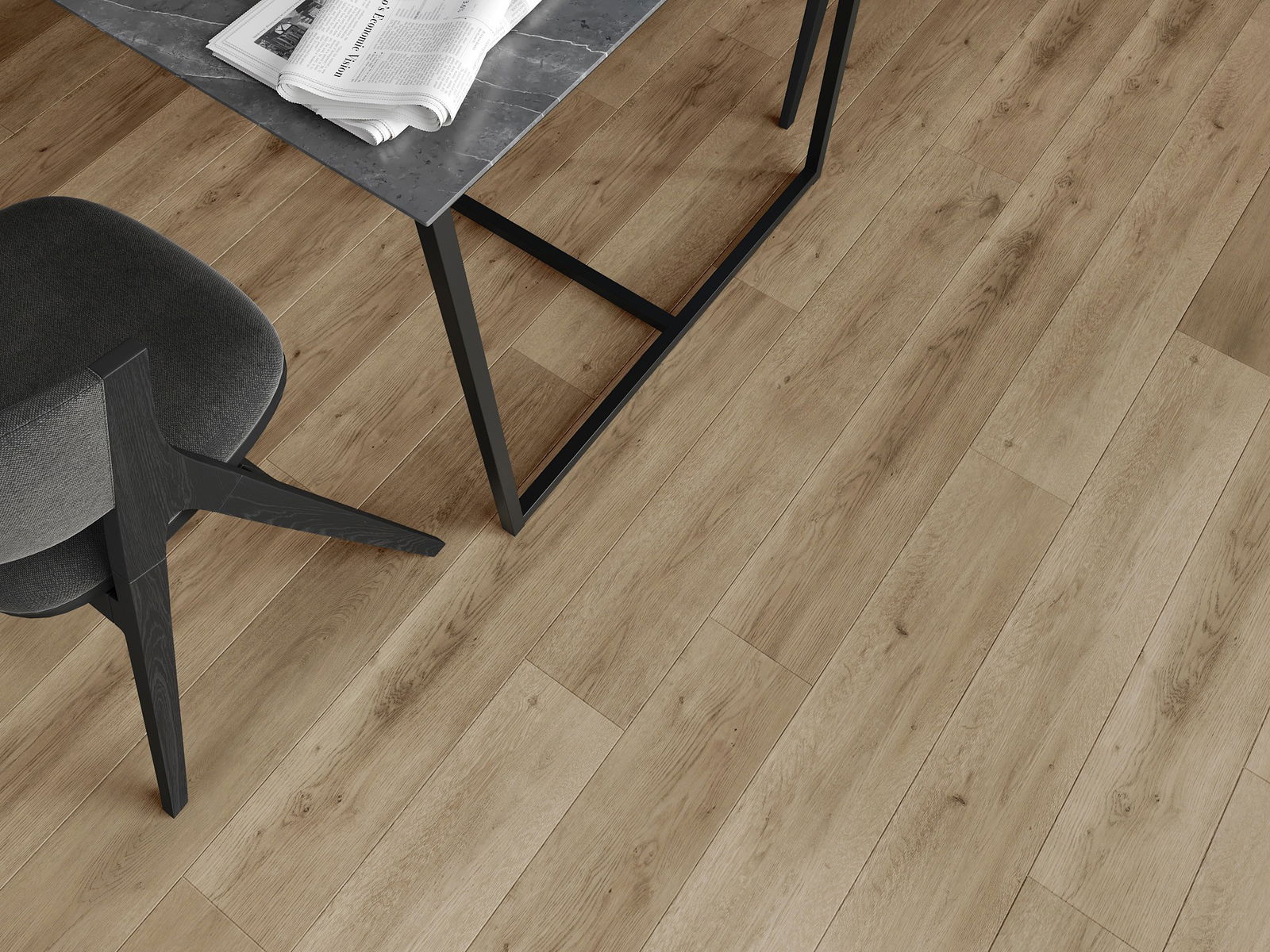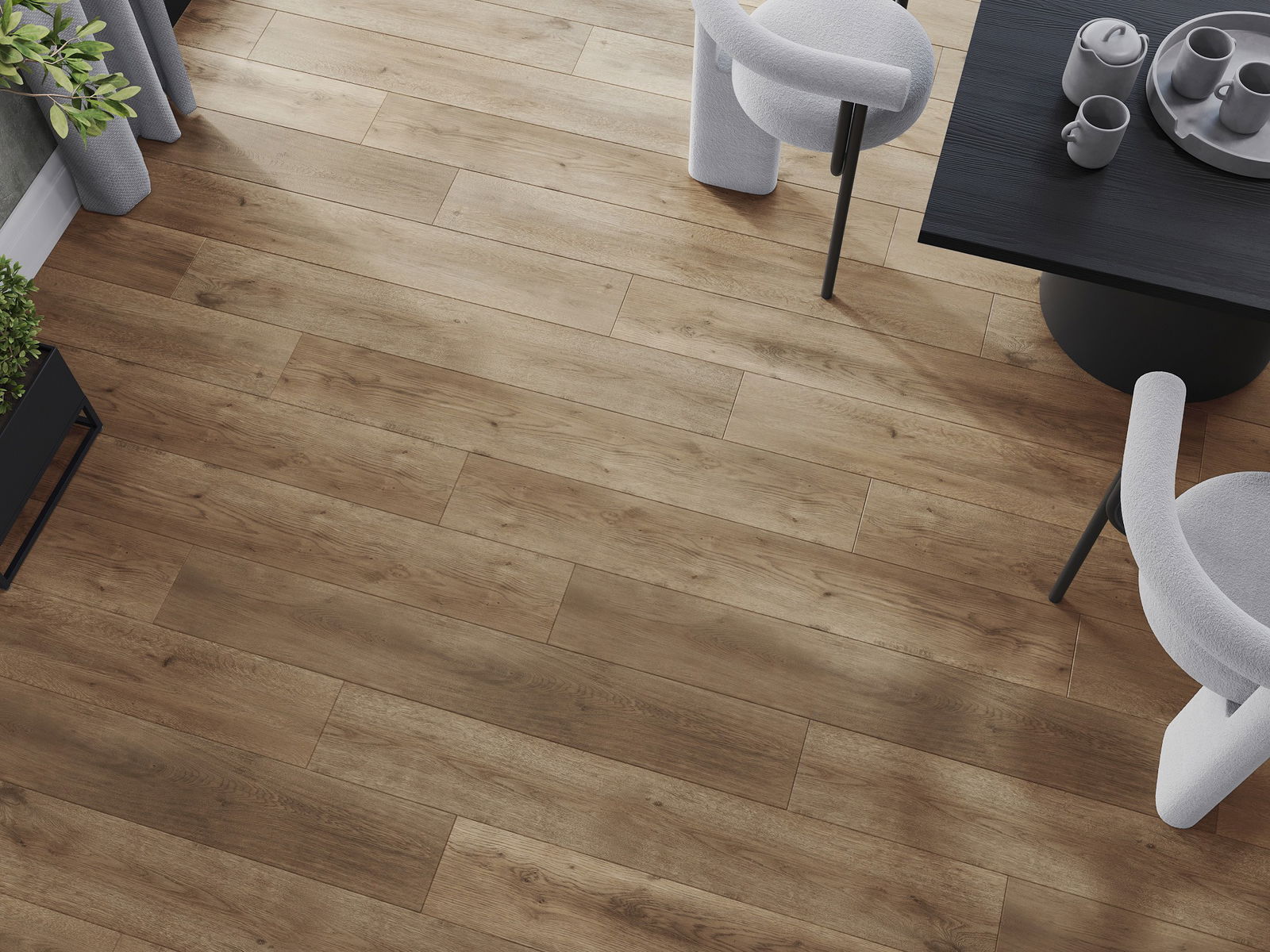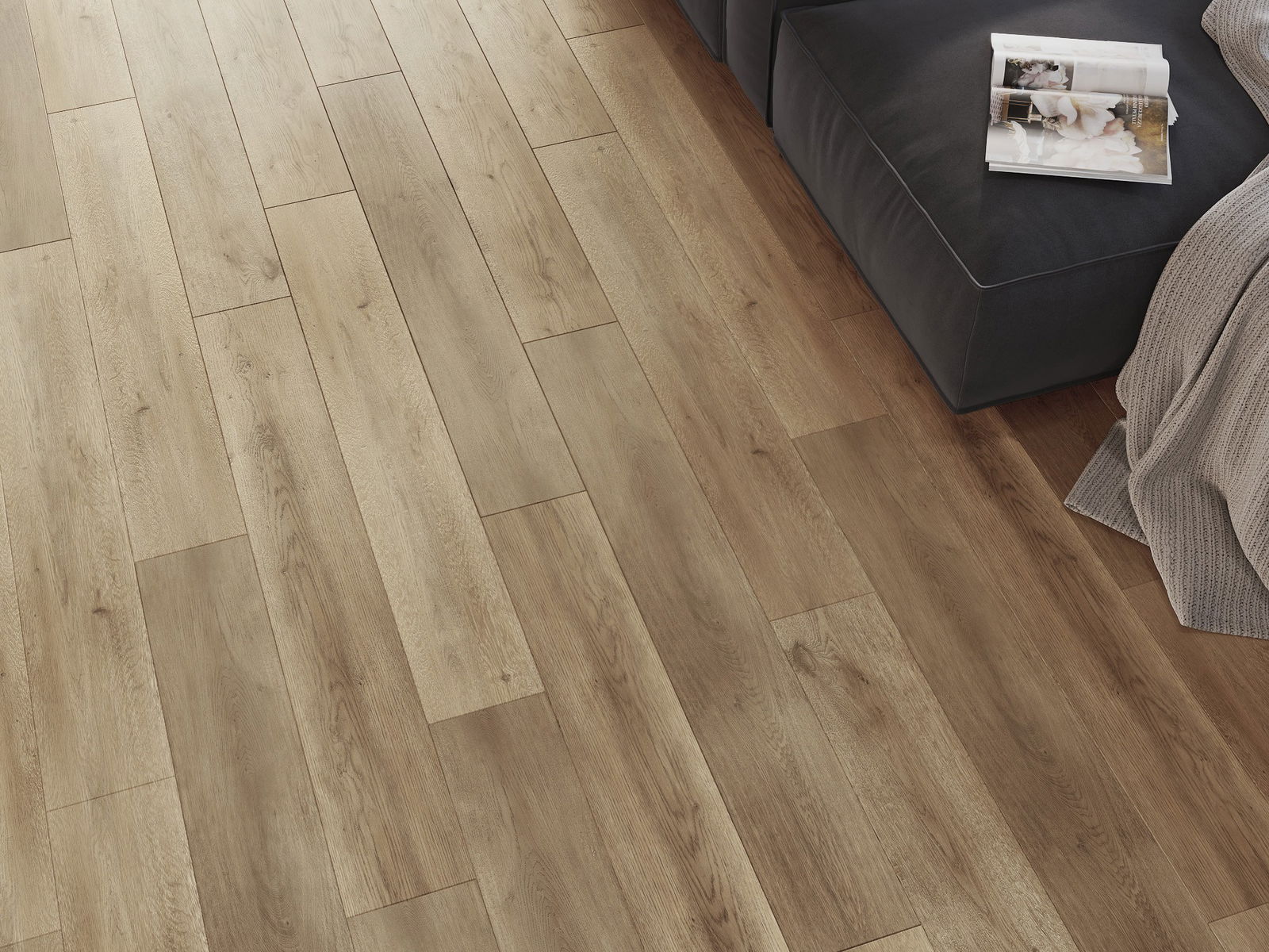 Paneļiem ir 4-pusējs fuga - katra mala ir frēzēta tā, lai pēc ieklāšanas izveidotos savienojums burta "V" formā. Šāds dizains padara grīdu izteiksmīgāku, piešķirot tai dziļumu un estētisku raksturu. Šis efekts ir īpaši novērtēts mūsdienu interjeros, kur detaļas izceļ telpas unikālo izskatu.