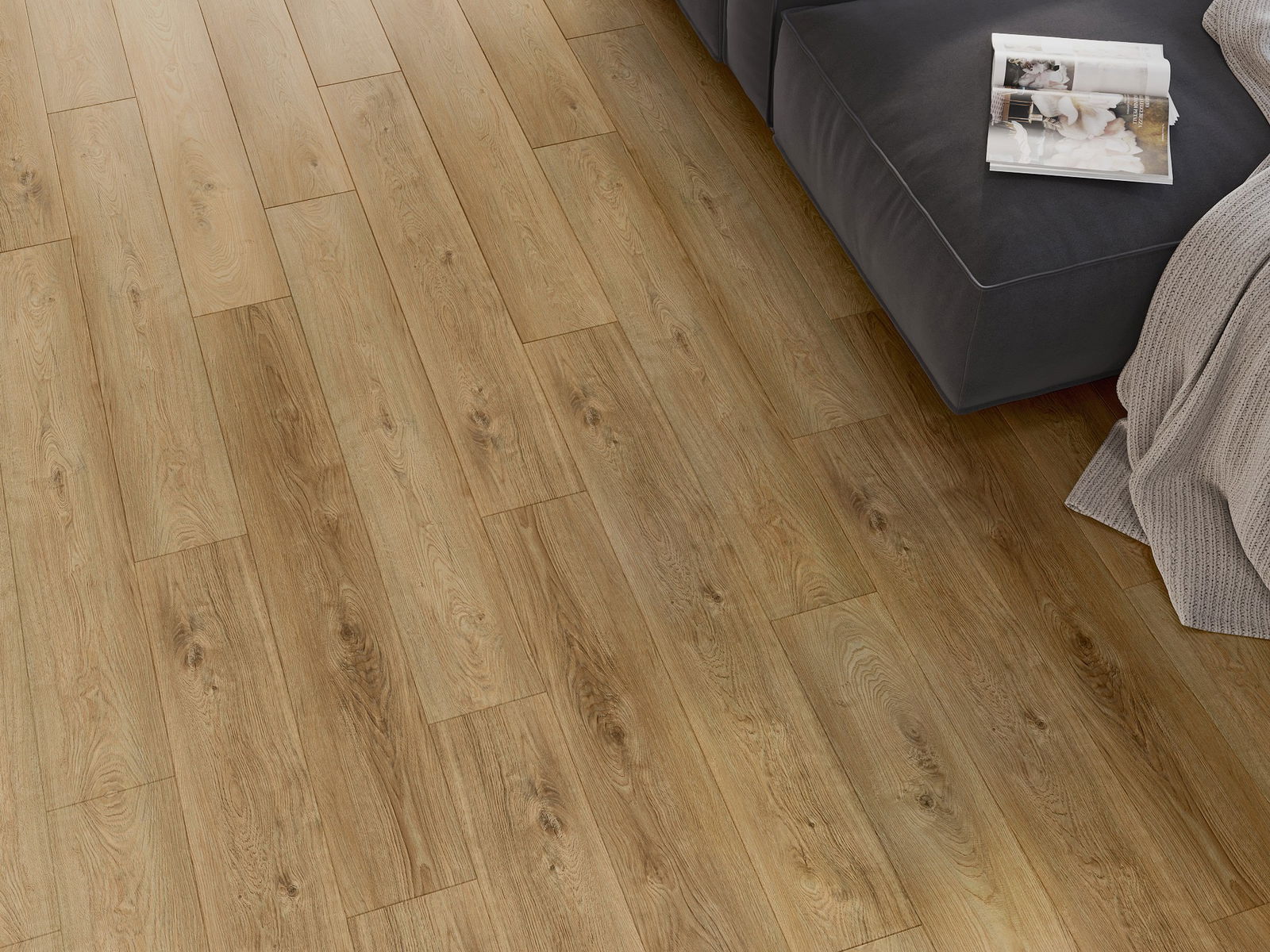 Paneļiem ir 4-pusējs fuga - katra mala ir frēzēta tā, lai pēc ieklāšanas izveidotos savienojums burta "V" formā. Šāds dizains padara grīdu izteiksmīgāku, piešķirot tai dziļumu un estētisku raksturu. Šis efekts ir īpaši novērtēts mūsdienu interjeros, kur detaļas izceļ telpas unikālo izskatu.