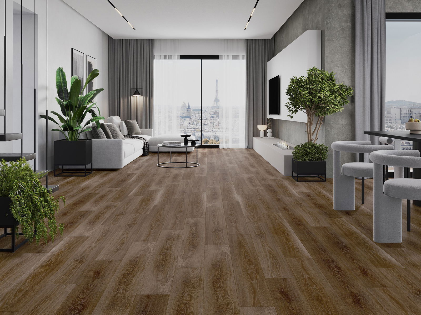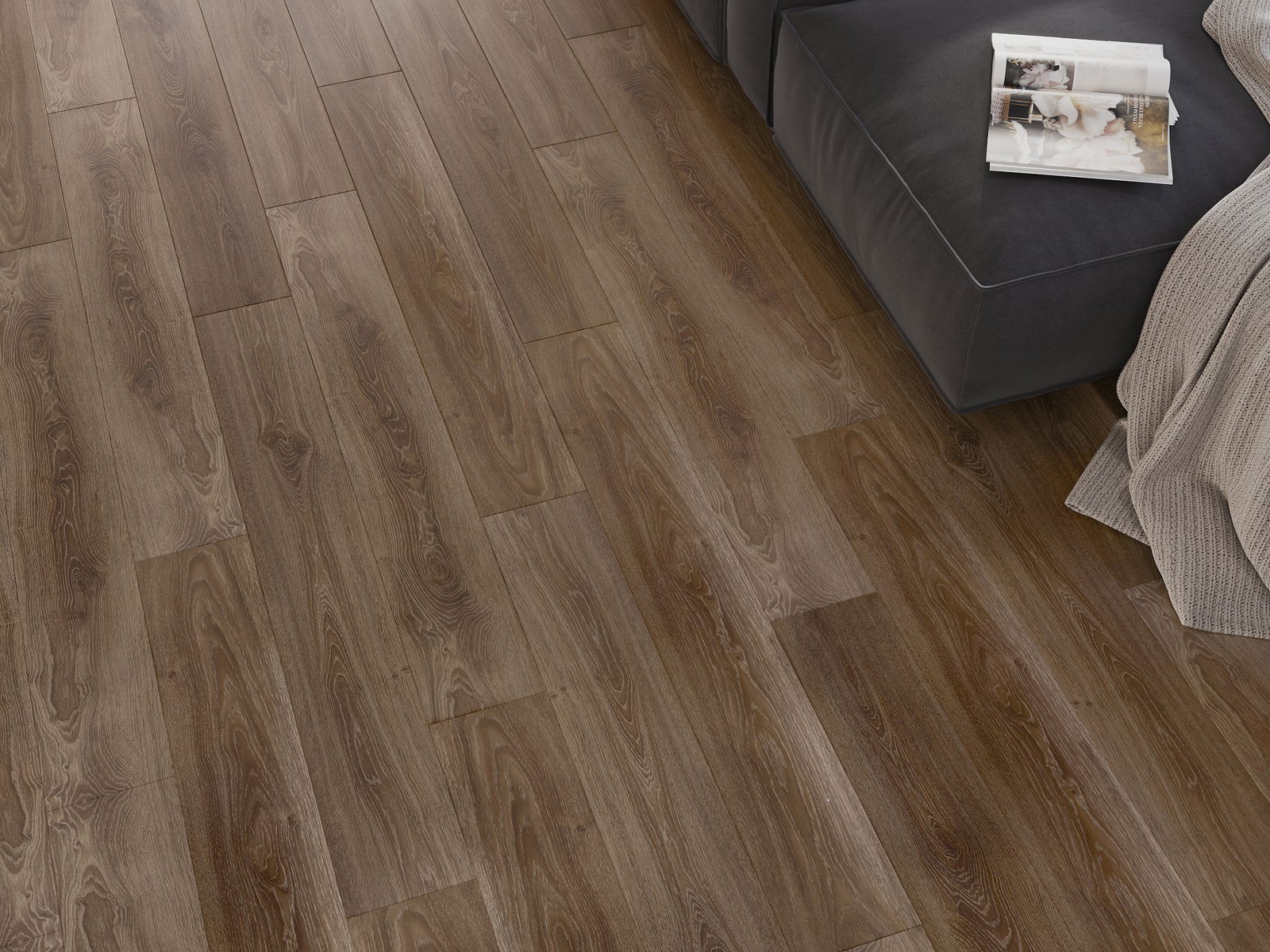 Paneļiem ir 4-pusējs fuga - katra mala ir frēzēta tā, lai pēc ieklāšanas izveidotos savienojums burta "V" formā. Šāds dizains padara grīdu izteiksmīgāku, piešķirot tai dziļumu un estētisku raksturu. Šis efekts ir īpaši novērtēts mūsdienu interjeros, kur detaļas izceļ telpas unikālo izskatu.
