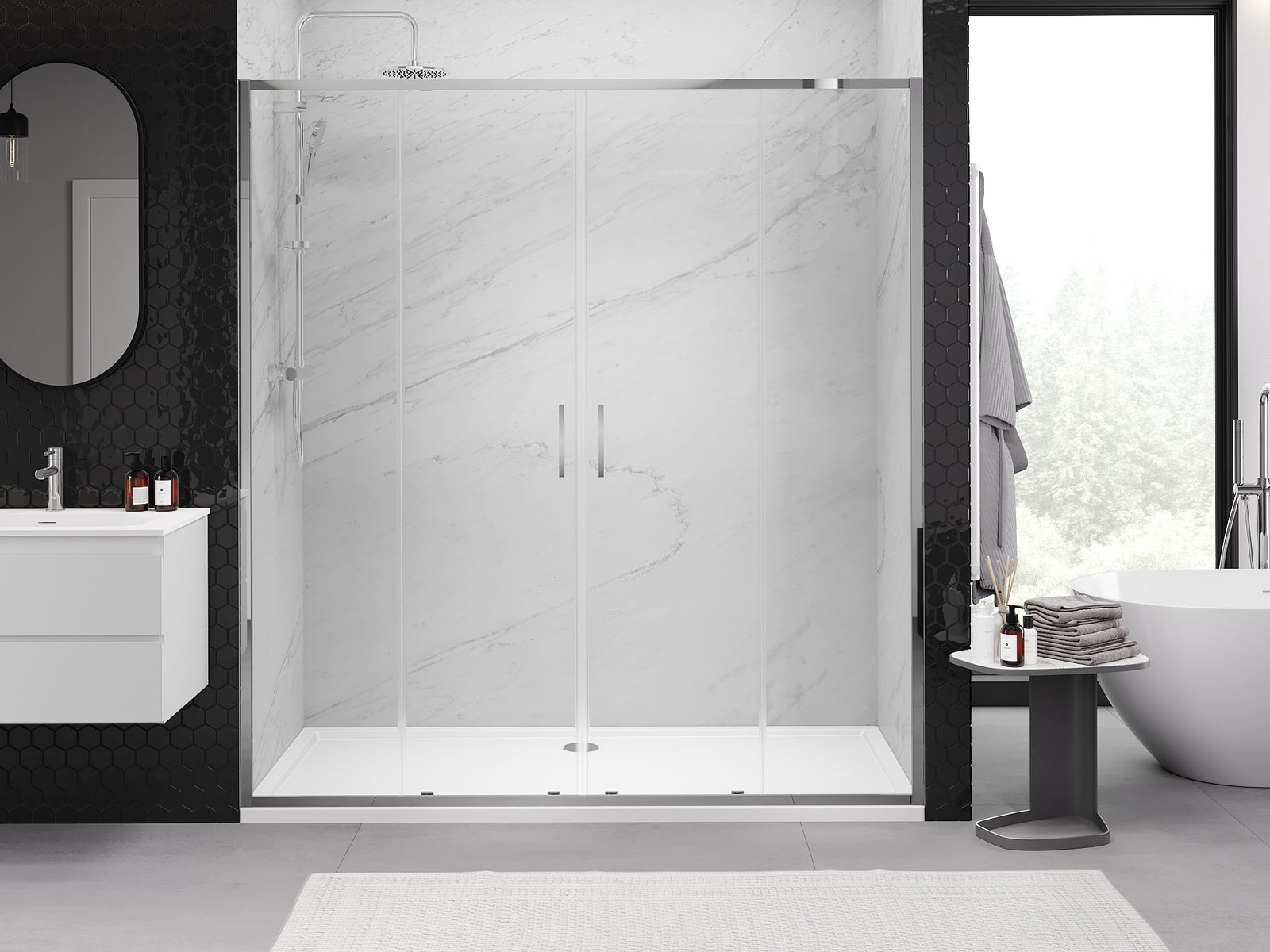 Pateicoties universālajai montāžas sistēmai, dušas durvis var uzstādīt no kreisās vai labās puses, atkarībā no vajadzībām. Tādējādi jūs varat viegli izstrādāt dušu, kas piemērota vannas istabas telpai.