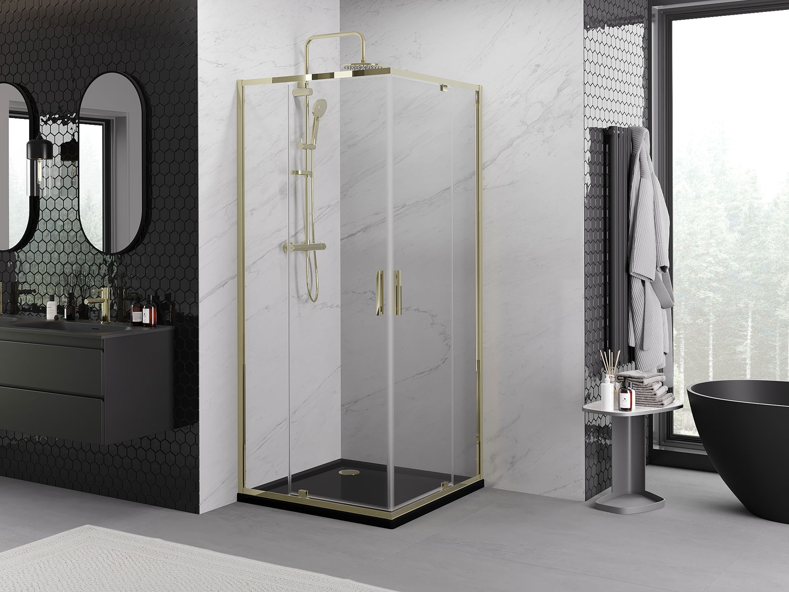 Mexen Exo kvadrātiska dušas kabīne, kas atverama, 100 x 100 cm, caurspīdīga, zelta - 8110-100-100-50-00