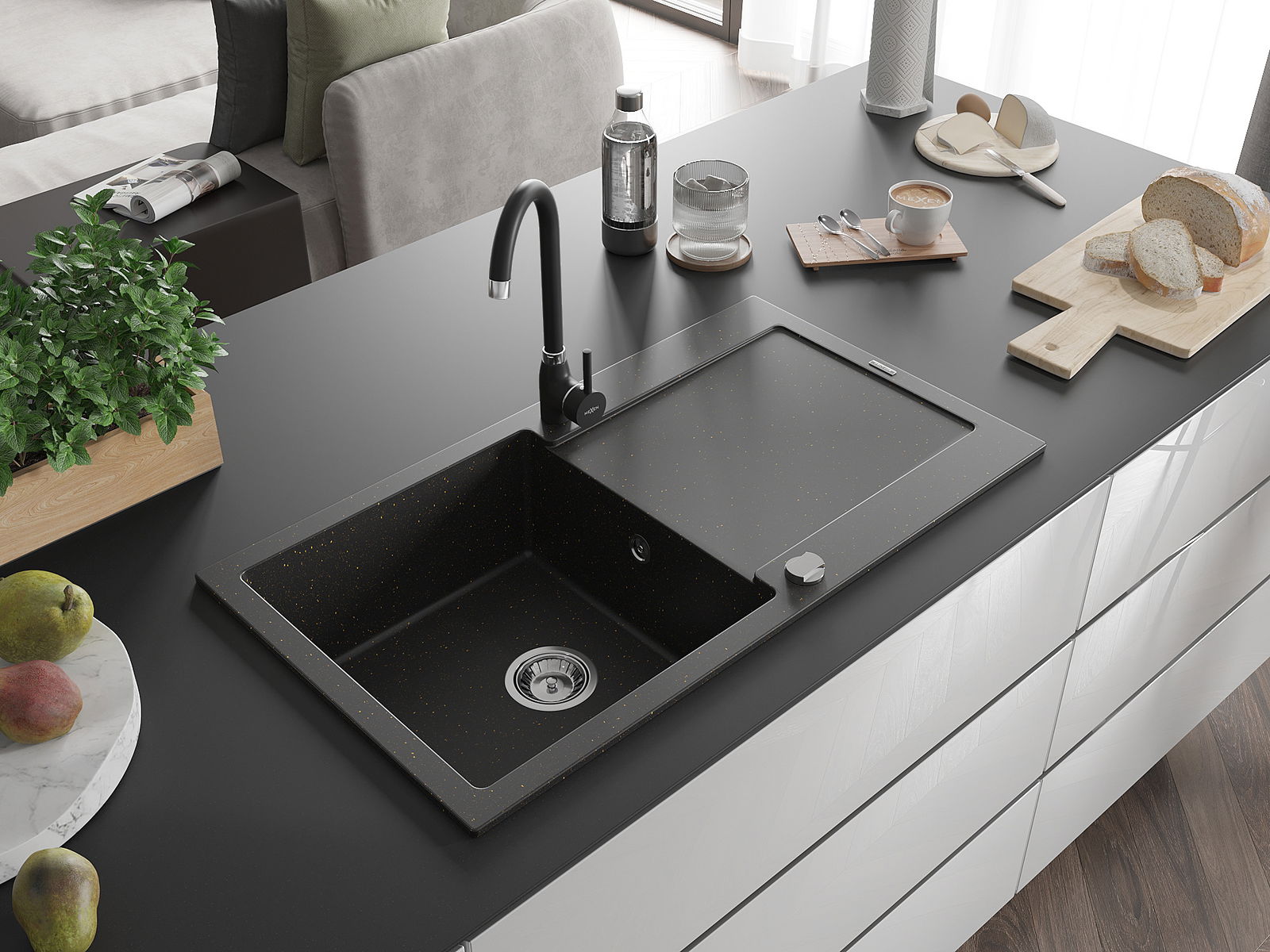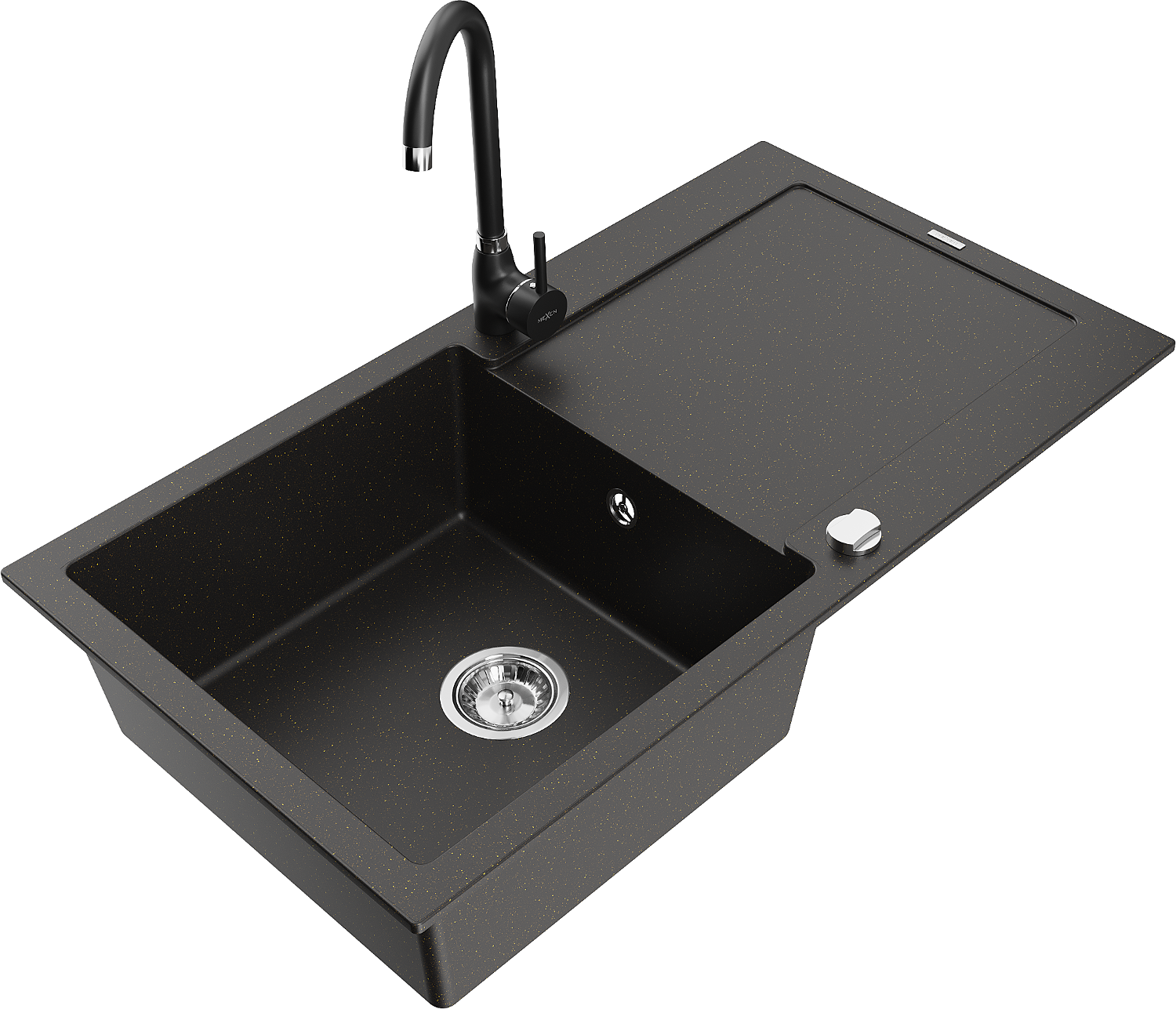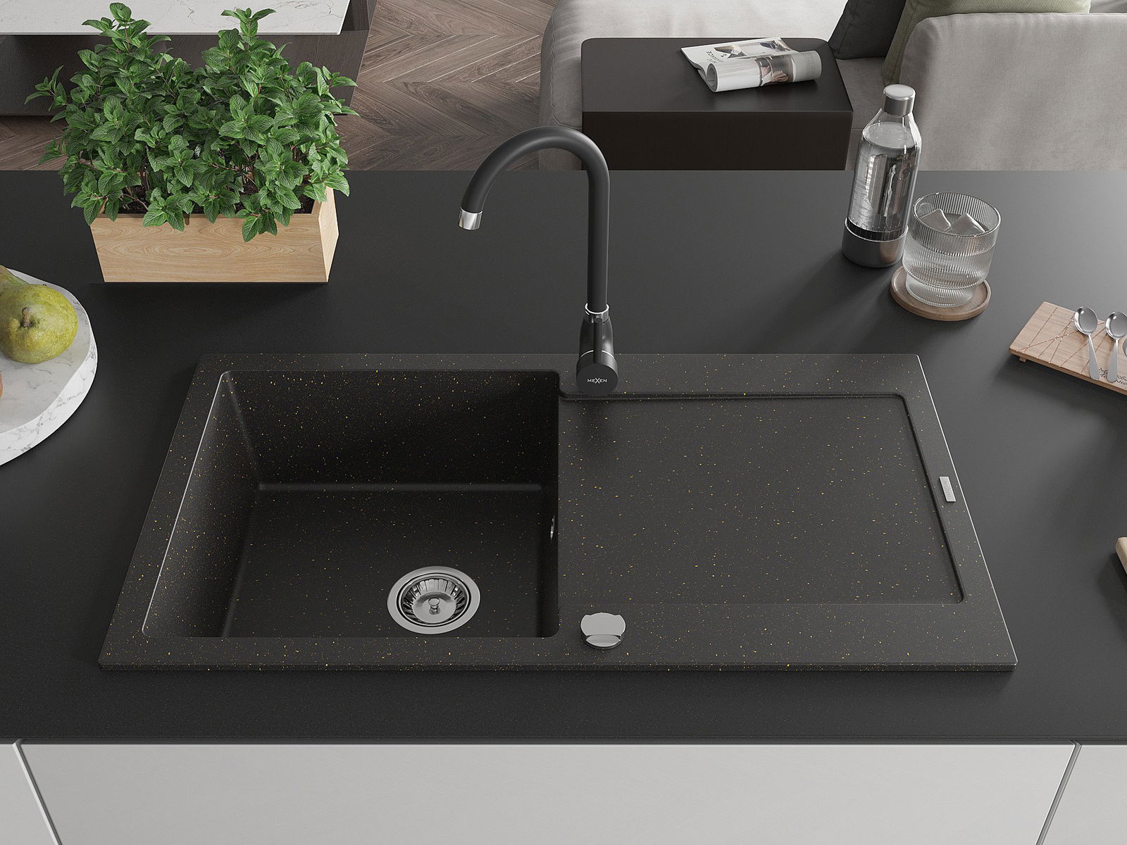 Mexen Leo vienas izlietnes granīta izlietne ar notecējumu un virtuves jaucējkrānu Telma, melns/zelta metālisks