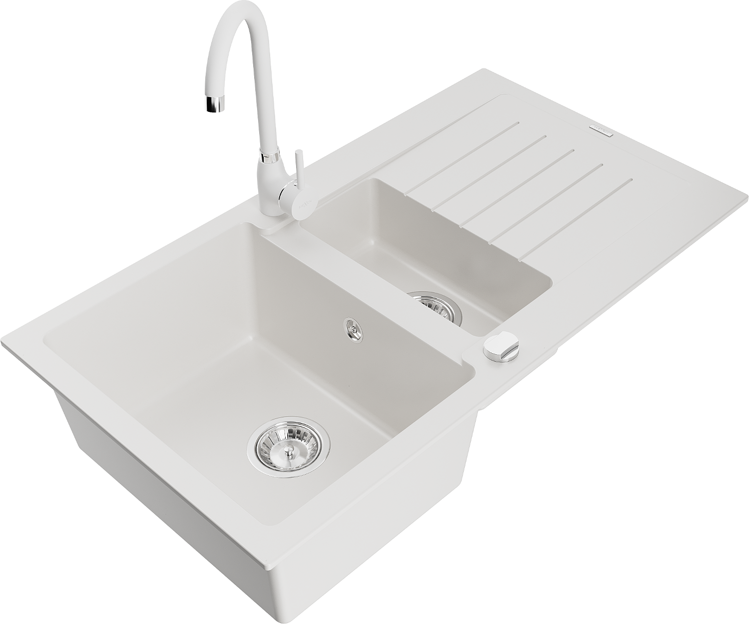 Mexen Matias 1,5 nodalīts granīta izlietne ar noteces zonu un virtuves jaucējkrānu Telma, balta - 6502-20-670200-20