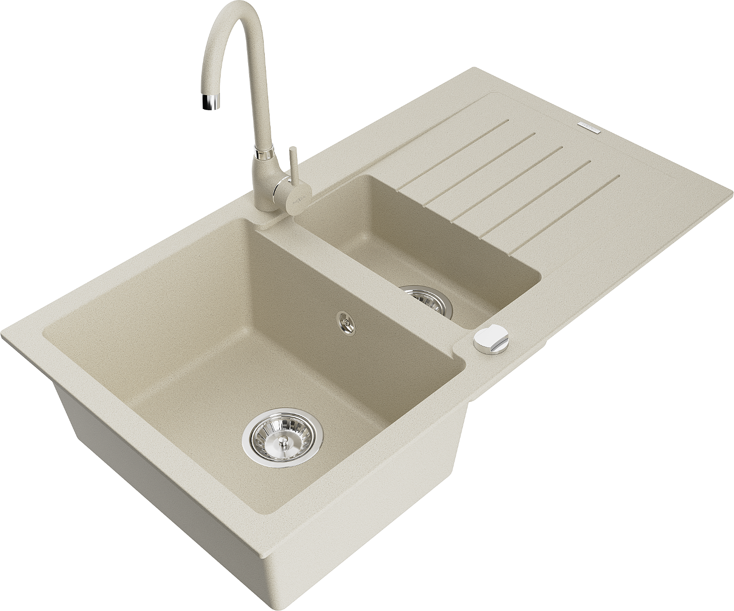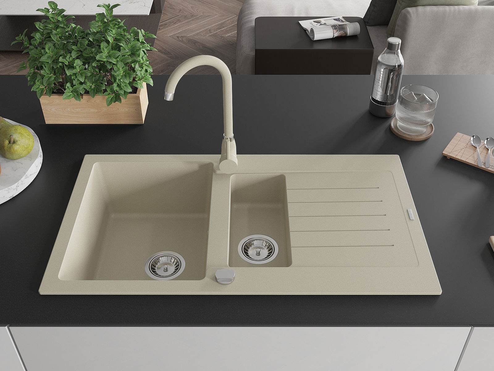 Mexen Matias granit izlietne ar 1,5 kamerām ar noteci un virtuves jaucējkrānu Telma, bēša - 6502-69-670200-69