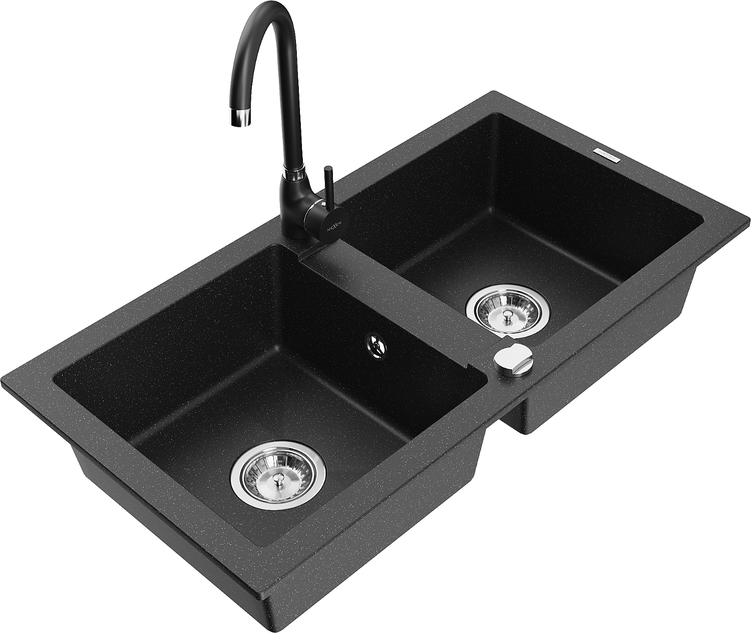 Mexen Mario granīta divu nodalījumu izlietne ar virtuves jaucējkrānu Telma, melna/sudraba - 6504-73-670200-70