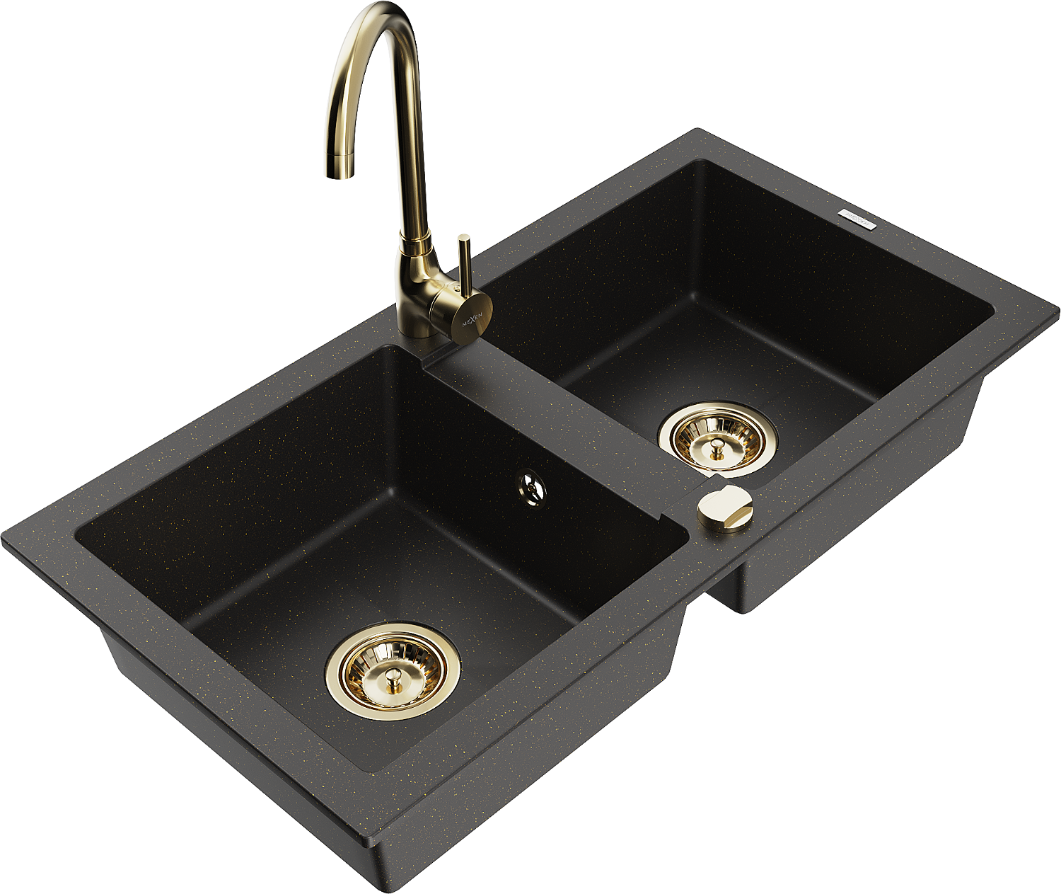 Mexen Mario divu nodalījumu granīta izlietne ar virtuvēm krānu Telma, melns/zeltains - 6504-75-670200-50