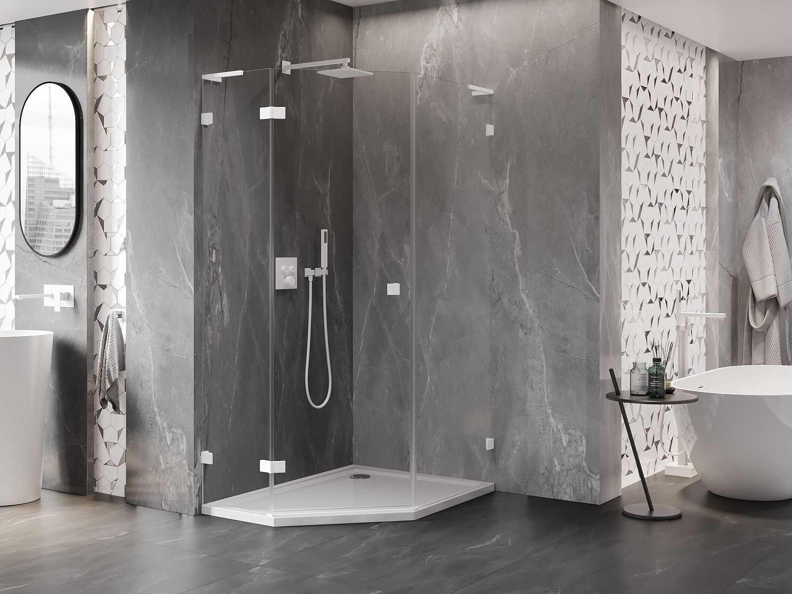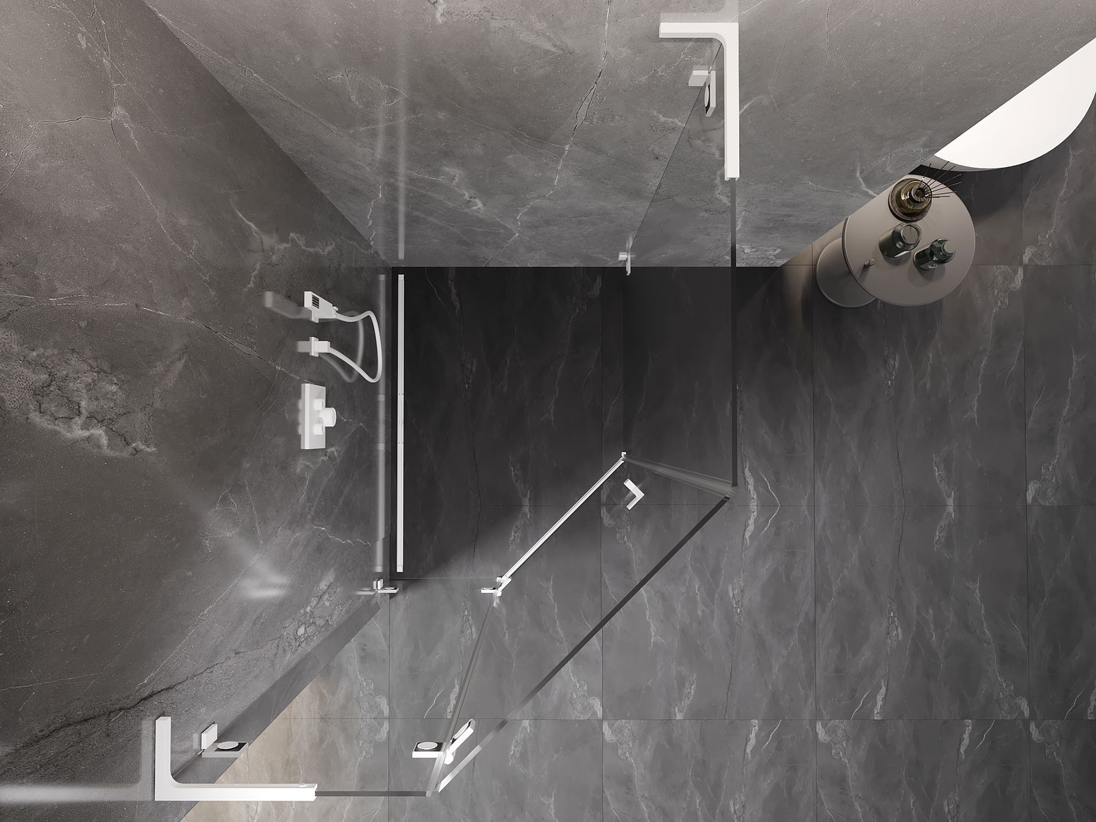 Skavas un eņģes ir izgatavotas no ļoti izturīga misiņa un papildus veido vienā līmenī esošu stikla virsmu. Tas ir lieliska izvēle, kas apvieno eleganci, izturību un modernu dizainu. Šādi risinājumi paaugstina dušas estētiku un vienlaikus atvieglo tīrības uzturēšanu.