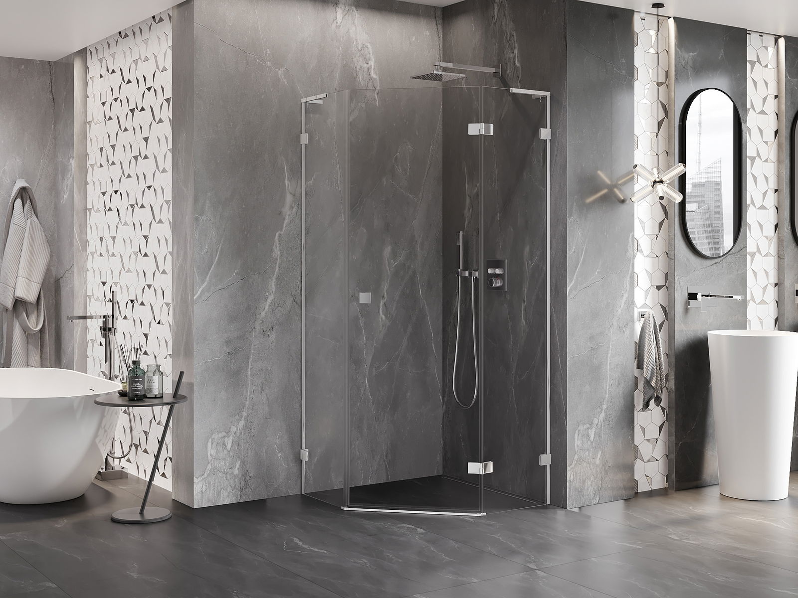 Skavas un eņģes ir izgatavotas no ļoti izturīga misiņa un papildus veido vienā līmenī esošu stikla virsmu. Tas ir lieliska izvēle, kas apvieno eleganci, izturību un modernu dizainu. Šādi risinājumi paaugstina dušas estētiku un vienlaikus atvieglo tīrības uzturēšanu.