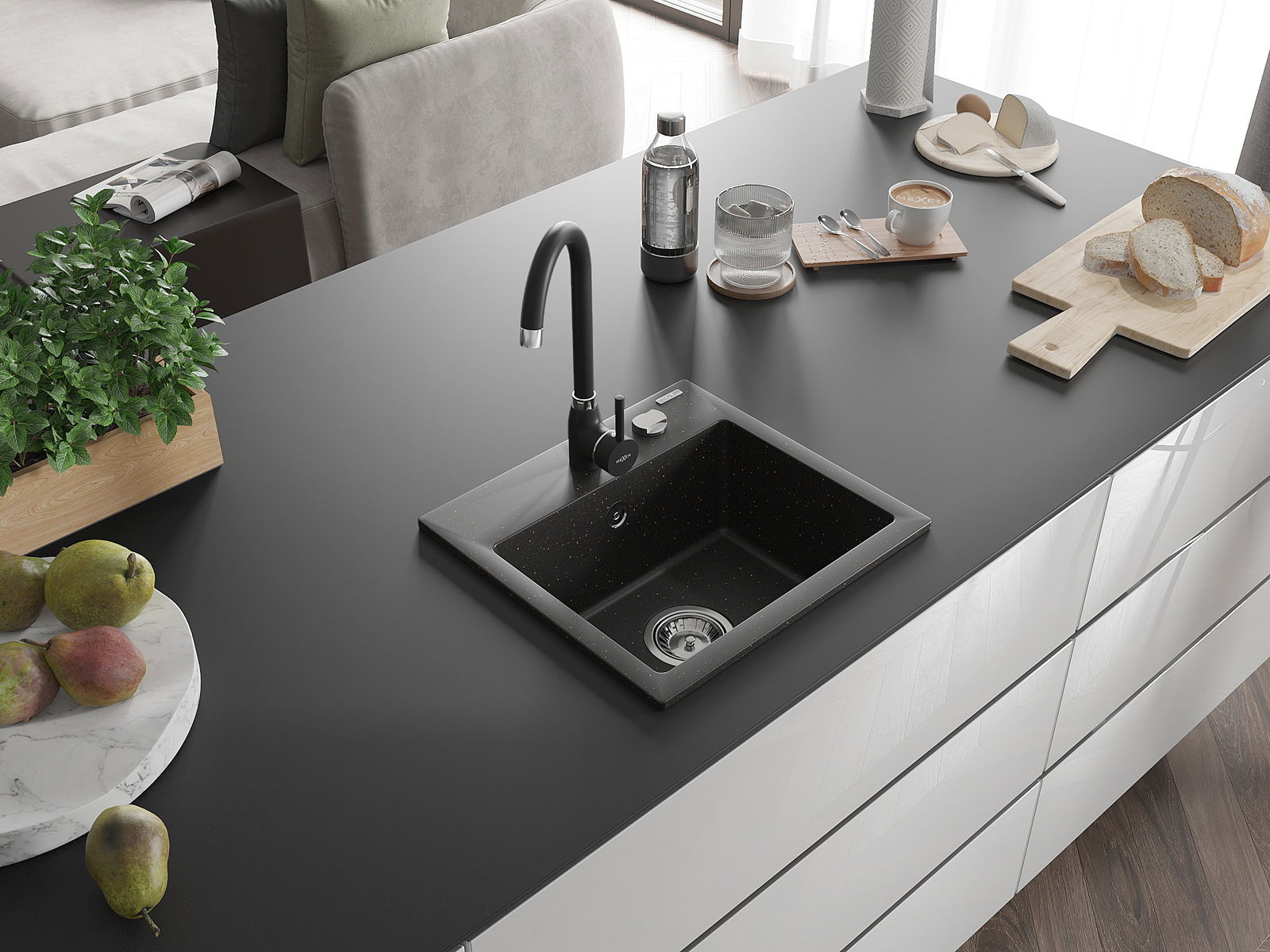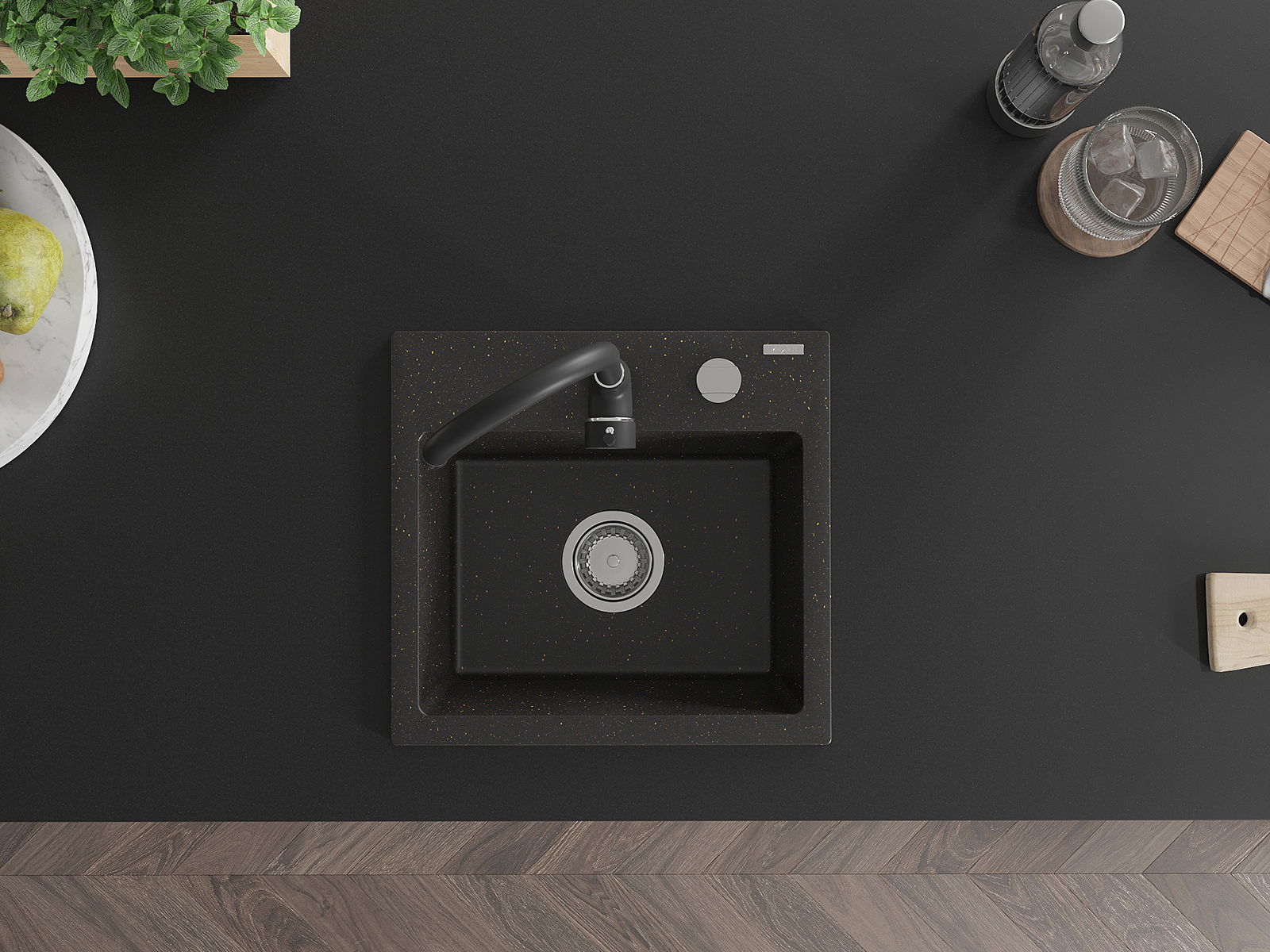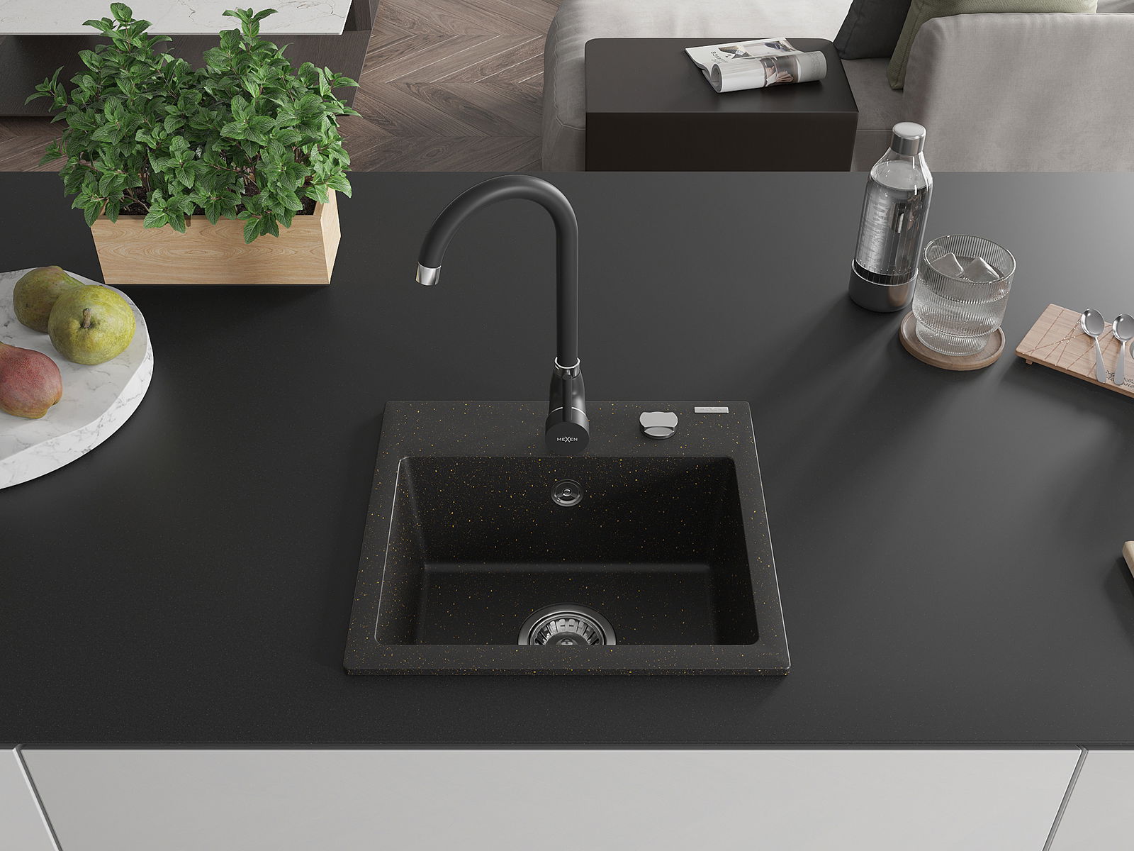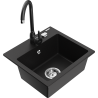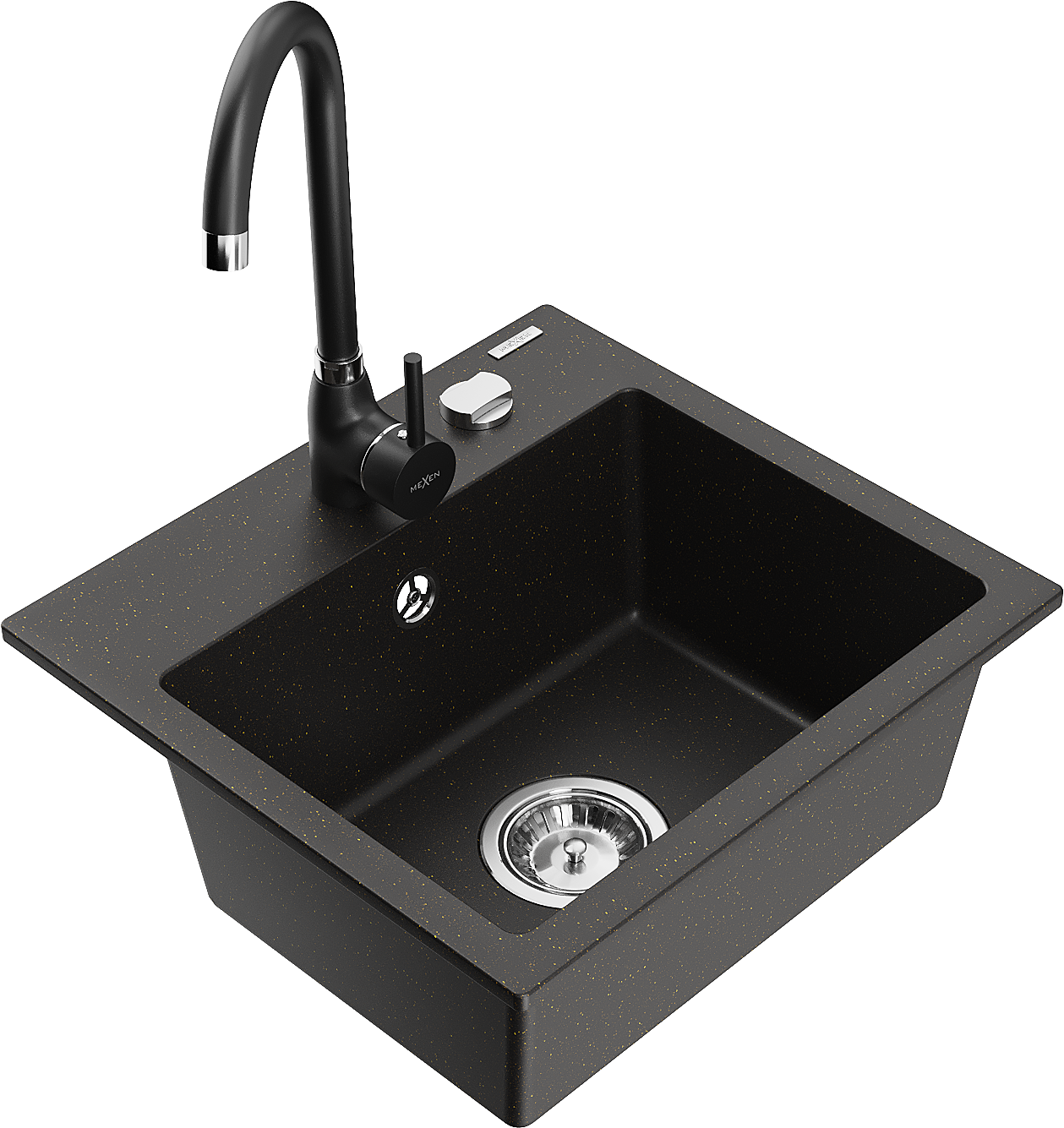 Mexen Milo granitēta izlietne ar vienu nodalījumu un virtuves jaucējkrānu Telma, melns/zeltīts - 6505-75-670200-70