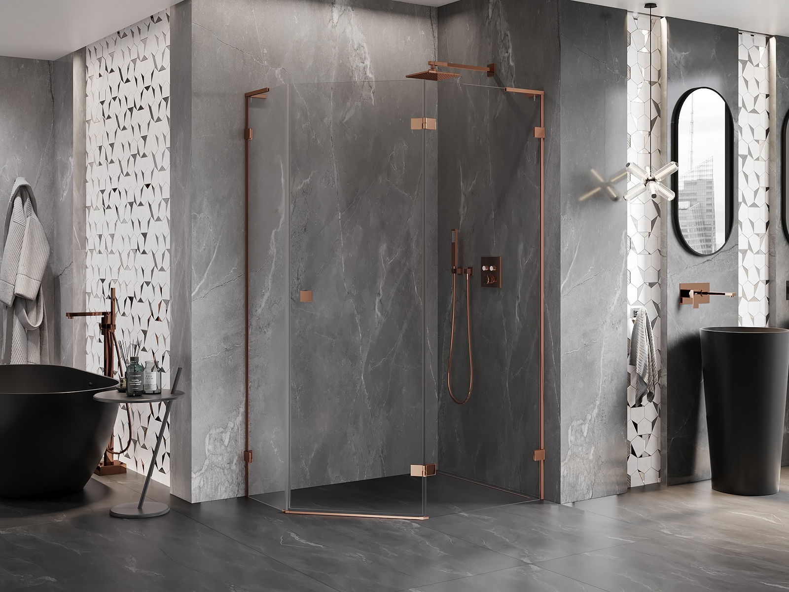 Skavas un eņģes ir izgatavotas no ļoti izturīga misiņa un papildus veido vienā līmenī esošu stikla virsmu. Tas ir lieliska izvēle, kas apvieno eleganci, izturību un modernu dizainu. Šādi risinājumi paaugstina dušas estētiku un vienlaikus atvieglo tīrības uzturēšanu.