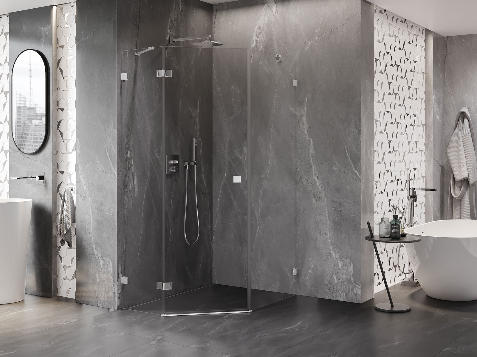 Skavas un eņģes ir izgatavotas no ļoti izturīga misiņa un papildus veido vienā līmenī esošu stikla virsmu. Tas ir lieliska izvēle, kas apvieno eleganci, izturību un modernu dizainu. Šādi risinājumi paaugstina dušas estētiku un vienlaikus atvieglo tīrības uzturēšanu.