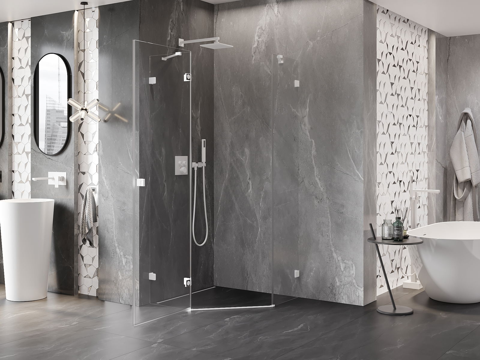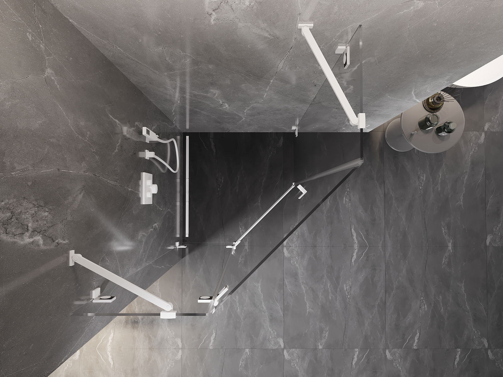 Skavas un eņģes ir izgatavotas no ļoti izturīga misiņa un papildus veido vienā līmenī esošu stikla virsmu. Tas ir lieliska izvēle, kas apvieno eleganci, izturību un modernu dizainu. Šādi risinājumi paaugstina dušas estētiku un vienlaikus atvieglo tīrības uzturēšanu.