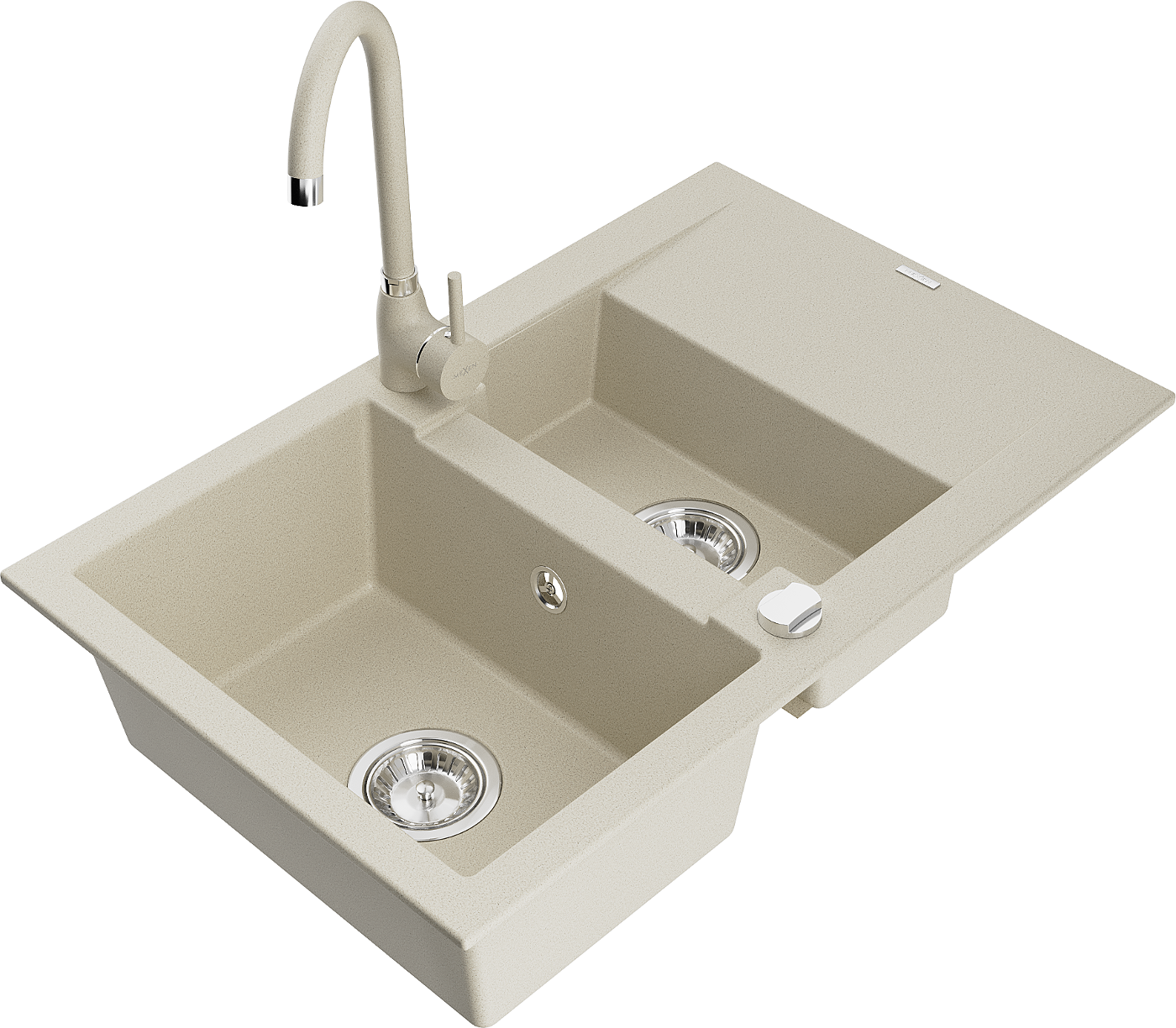 Mexen Gaspar granīta izlietne ar 1,5 nodalījumiem, ar notekpaplāti un virtuves jaucējkrānu Telma, bēša - 6507-69-670200-69