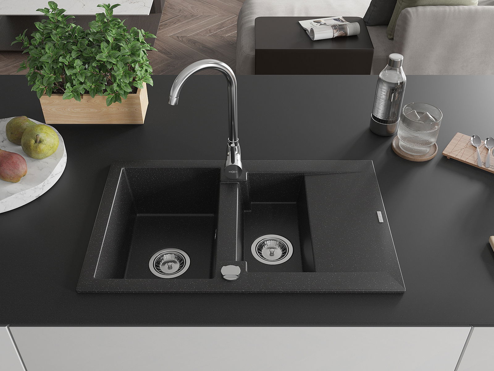 Mexen Gaspar granitna izlietne 1,5 nodalījumu ar noteku un virtuves jaucējkrānu Telma, melns/sudrabs - 6507-73-670200-00