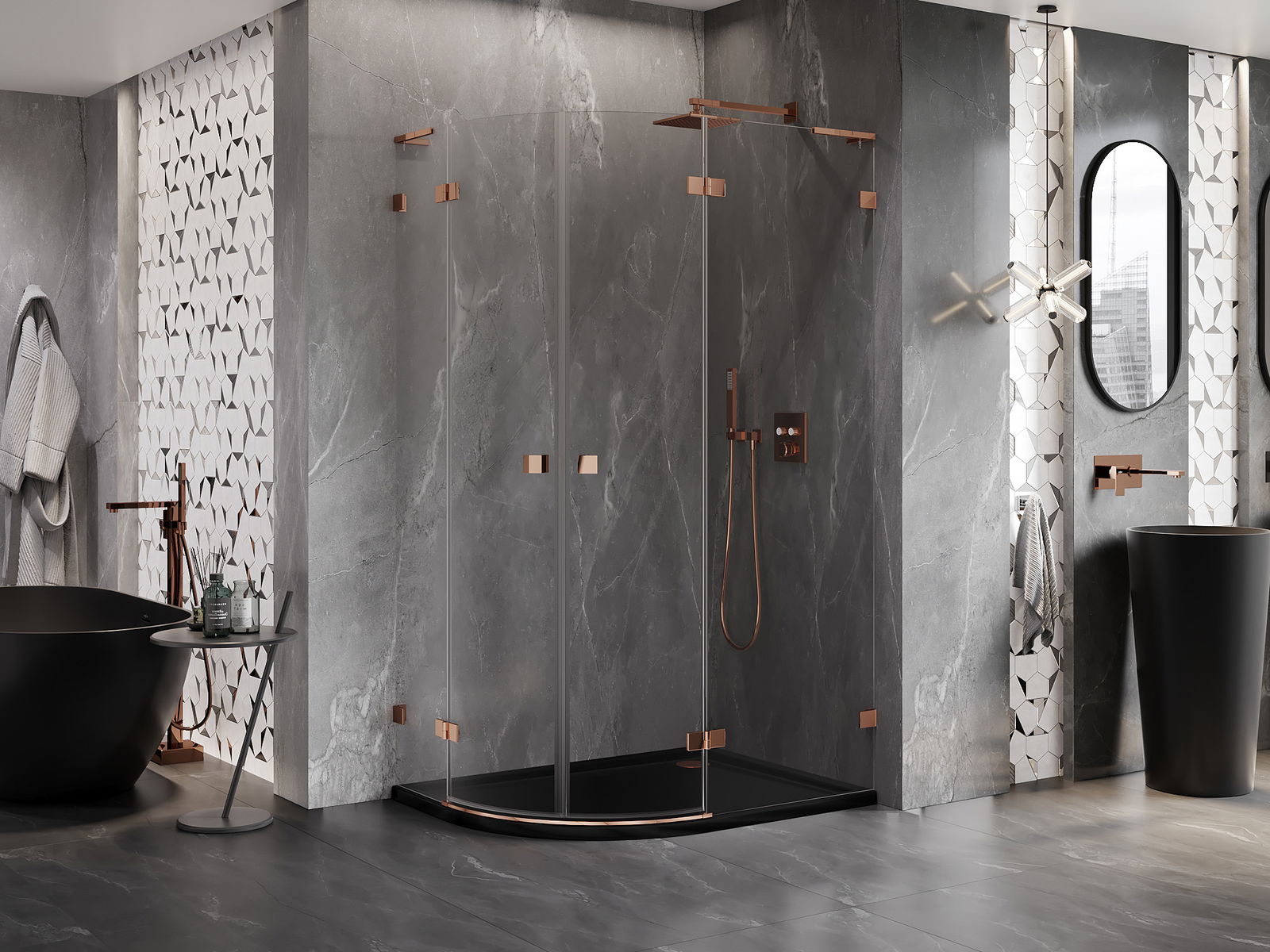 Skavas un eņģes ir izgatavotas no ļoti izturīga misiņa un papildus veido vienā līmenī esošu stikla virsmu. Tas ir lieliska izvēle, kas apvieno eleganci, izturību un modernu dizainu. Šādi risinājumi paaugstina dušas estētiku un vienlaikus atvieglo tīrības uzturēšanu.