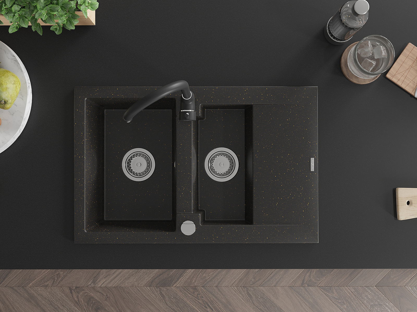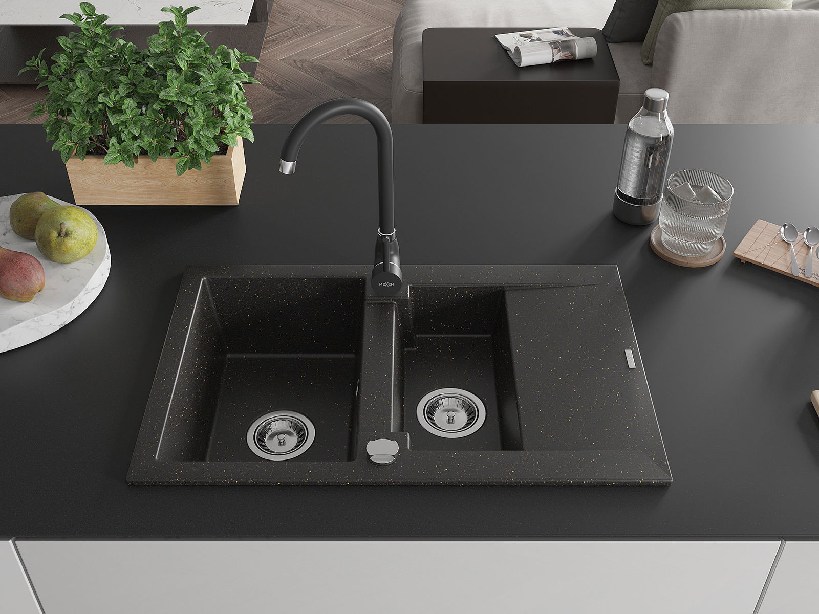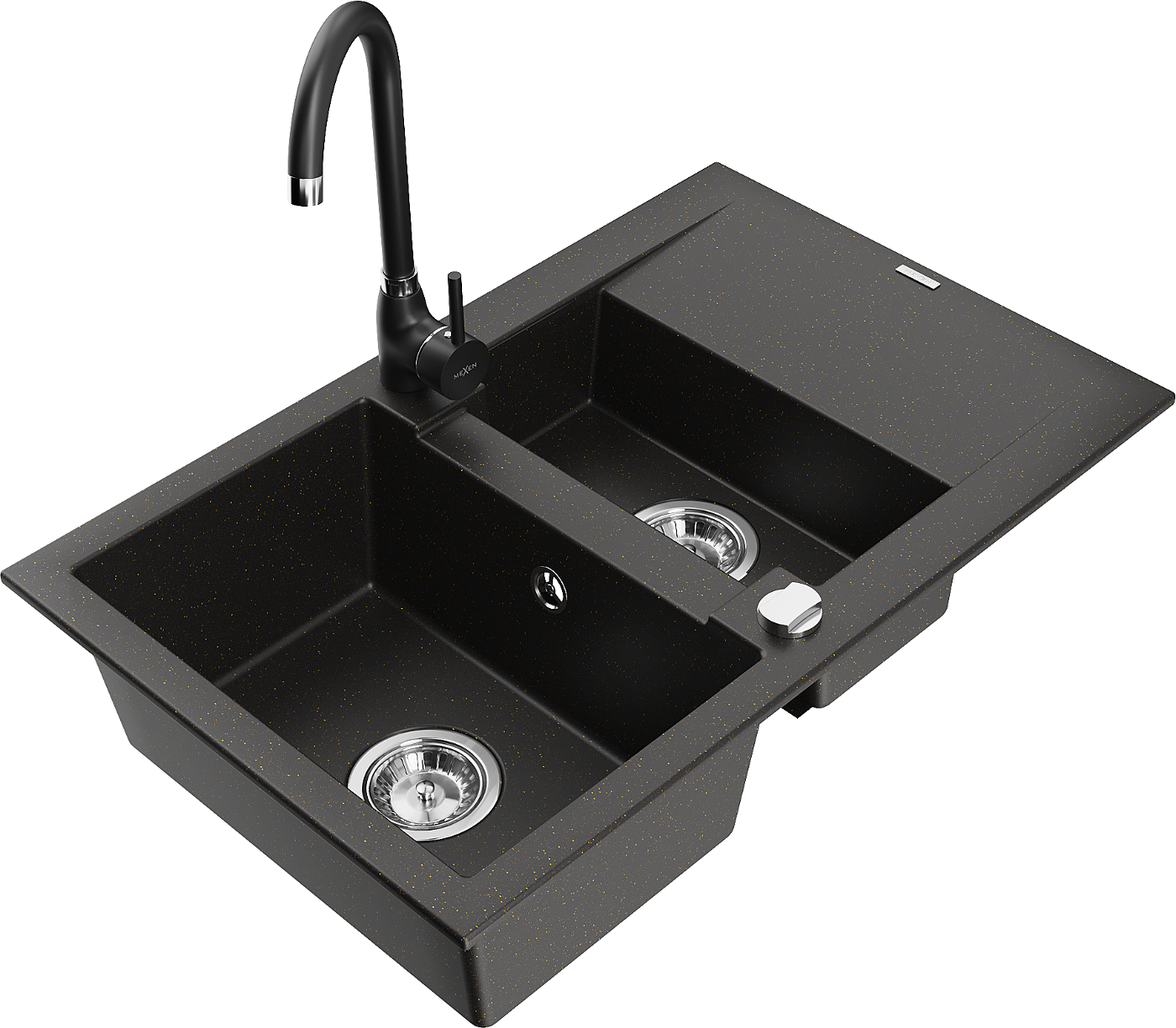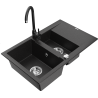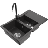 Mexen Gaspar granitā izlietne 1,5 nodalījumu ar notecējumu un virtuves jaucējkrānu Telma, melns/zeltains - 6507-75-670200-70