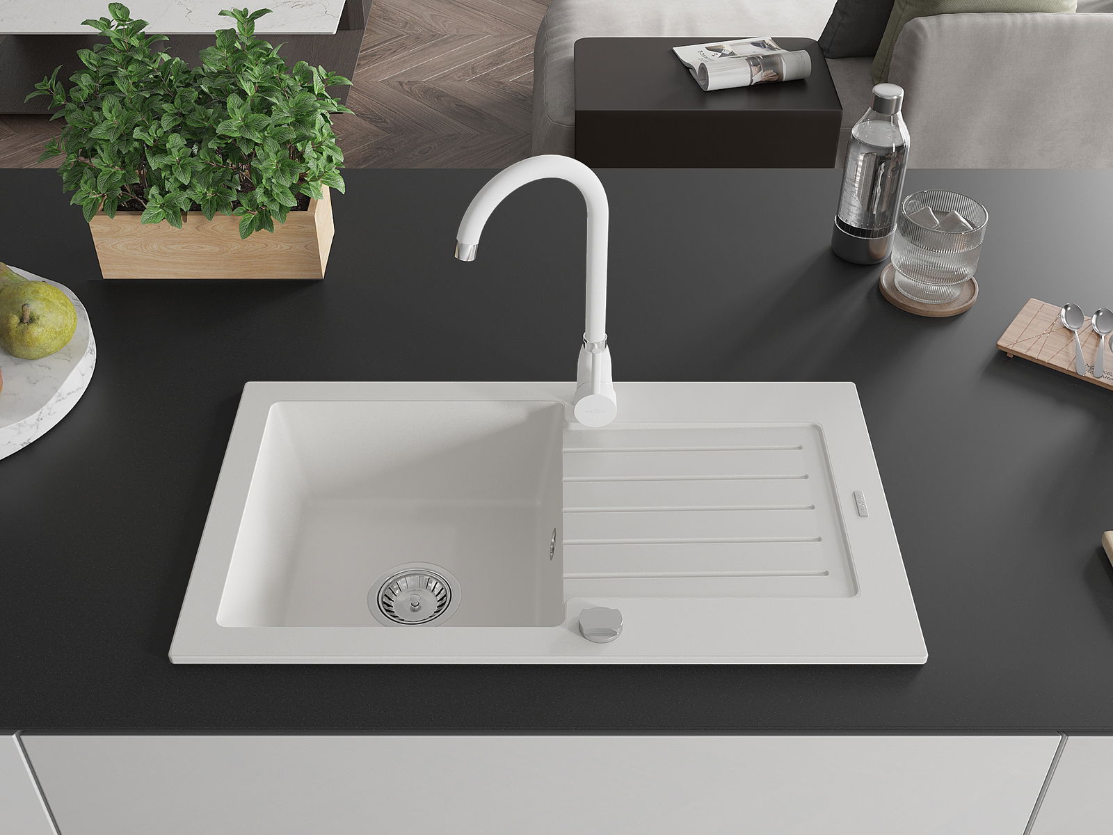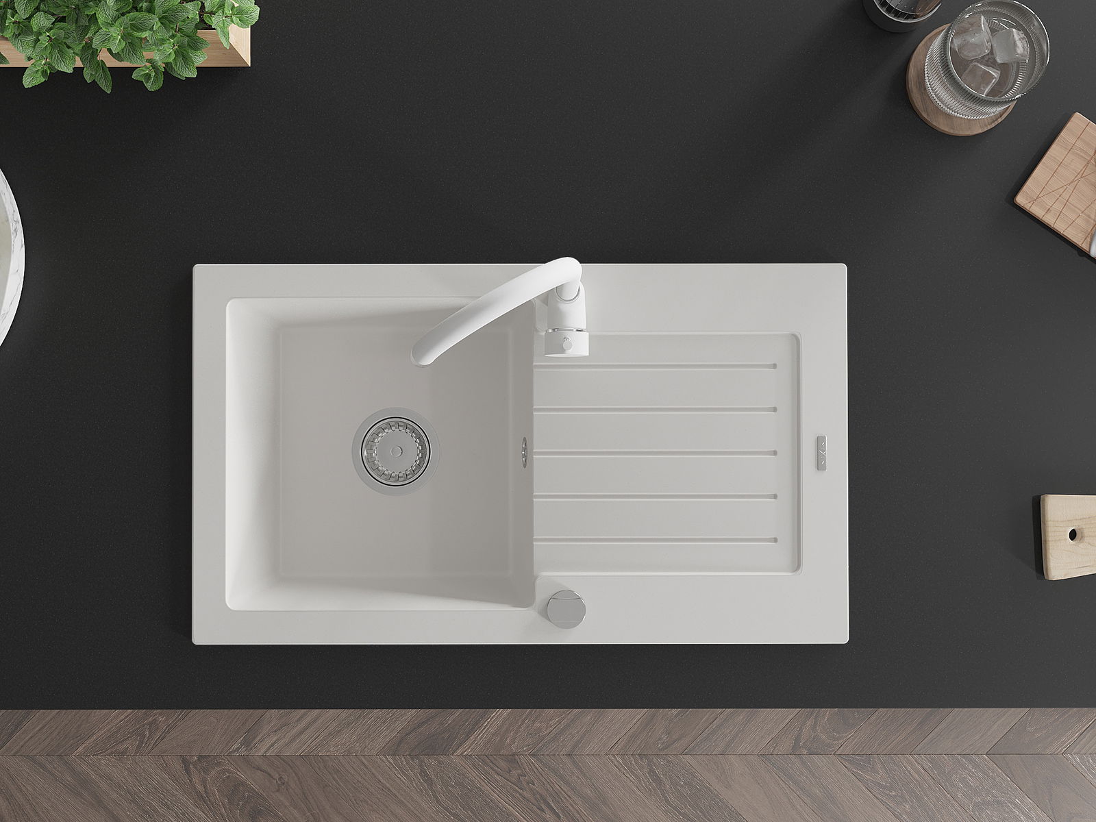 Mexen Pablo granit izlietne ar vienu nodalījumu ar noteci un virtuves jaucējkrānu Telma, balta - 6510-20-670200-20